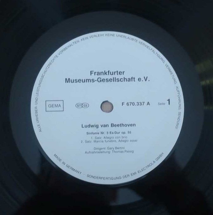 自主制作のものだろうかフランクフルト歌劇場のレコードとある。しかも未開封だった。ベルティーニらしい引き締まったバランスの良い音響が特徴で活き活きとしている。特に1楽章が程よい緊張感の中オーケストラが燃えまくる名演。ところどころスピードについて行けていないところも出てきてしまうくらい速い。全体としても同じ傾向で、なぜそんなに急ぐという感じもするくらいかなり速いテンポで一気に駆け抜ける英雄となっている。