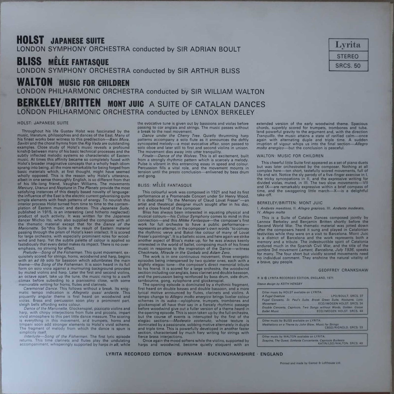 日本の雰囲気をホルストはものすごくうまく表現した名曲。もっと演奏されて良さそうな曲なのだが。そして何と言ってもボールトが指揮しているのがうれしい。老境に差し掛かっている時期の録音で落ち着いた雰囲気のなかで情緒豊かに演奏を仕上げているのが素晴らしい。惑星と同時期に作曲されているこの曲は、特に日本でもっと演奏されてほしい。
