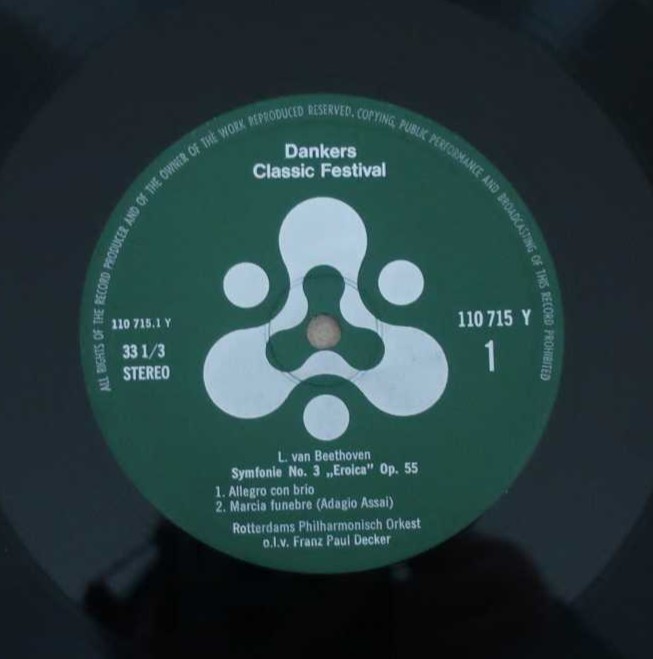 1966年にロッテルダムフィルの本拠地のホールが再建されたときの演奏のようである。その時に常任指揮者だったデッカーが指揮した英雄。機動力を生かすのか、大きなスケールで描くのか、どっちともつかずいい意味でも悪い意味でも中庸。ライトナーやワルベルク、ヴァントなど、リズムに重みをもたせ、テンポをゆったり取っても弛むことなくフォルムをしっかり作るタイプの指揮者で安心して聴ける面もある。その中でもこの演奏の白眉は第2楽章であろう。かなり遅めのテンポで始まりじっくり作り上げていく。中間部は逆に多少早めにとりその対比が面白いところ。残念なのは途中で表裏がわかれてしまうところ。