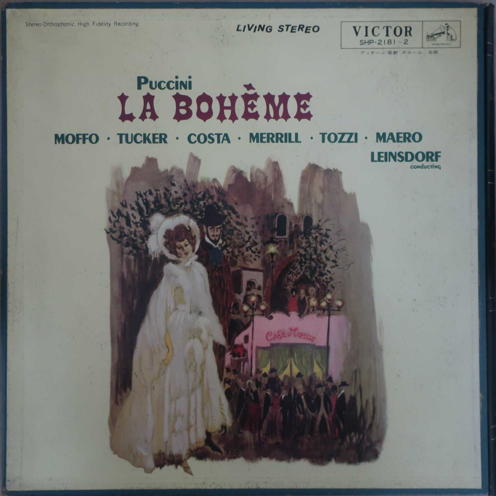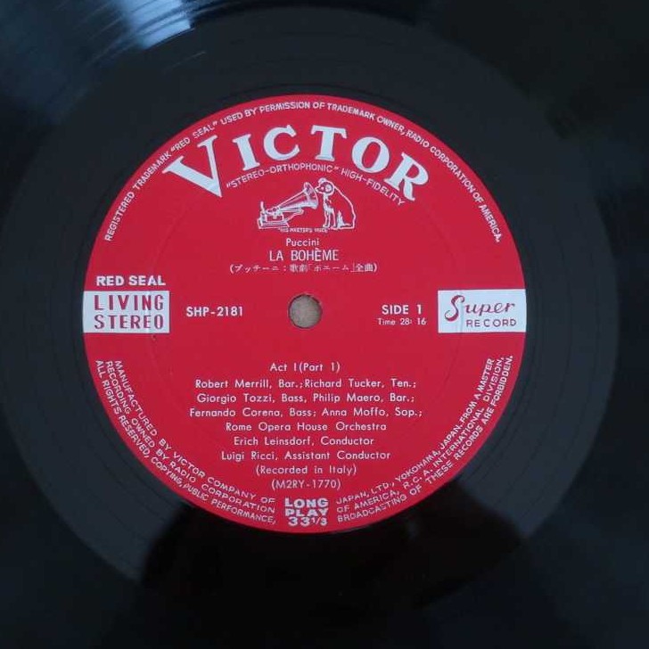 指揮:エーリヒ・ラインスドルフ、ローマ歌劇場O、Cho、T:リチャード・タッカー、S:アンナ・モッフォ、Br:ロバート・メリル、S:メリー・コスタ、Bs:ジョルジョ・トッツィ、Br:フィリップ・マエロ、Br:フェルナンド・コレナ (Cond: E.Leinsdorf, Roma Opera O, Cho, T: R.Tucker, S: A.Moffo, Br: R.Merrill, S: M.Costa, Bs: G.Tozzi, Br: P.Maero, Br: F.Corena)