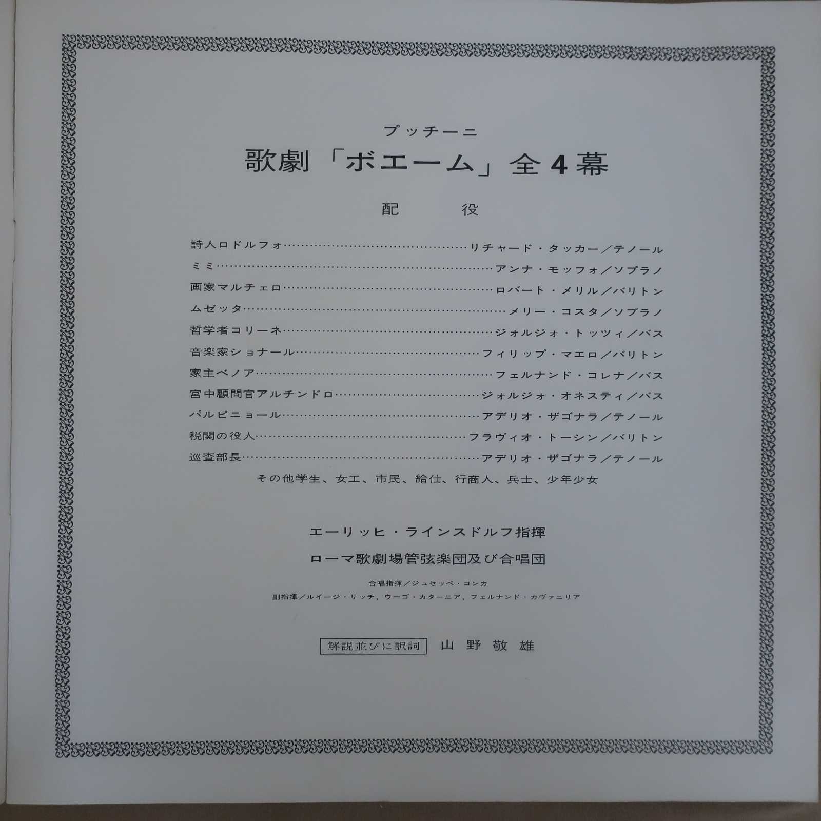 ラインスドルフの指揮が適度にまとまりが良く、適度に雑で勢いもあり、それをバックに歌手陣は自由に歌っているようで全体的に様式を保つというなかなか良い演奏である。その中でもモッフォの可憐で感情がこもった歌唱にうっとりさせられる。タッカーは直球勝負という感じだがちょっと抜けが悪いような気もするがこれは声の質なのだろう。そのほか歌手陣ではメリルも安定した声が特筆。どの歌手も歌いやすいテンポ、バランスで自由に歌いつつも全体として停滞せず引き締まった演奏になっている点でラインスドルフの手腕がうかがえる。残念ながら最後の面に傷あり(特に古い外套のところ)。