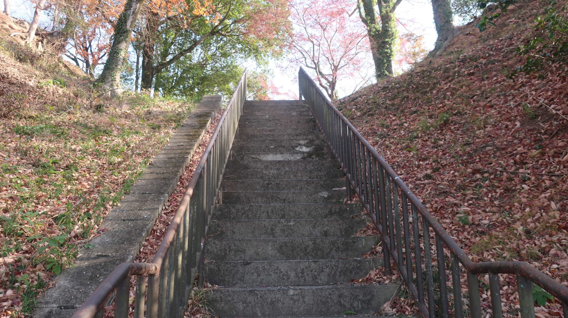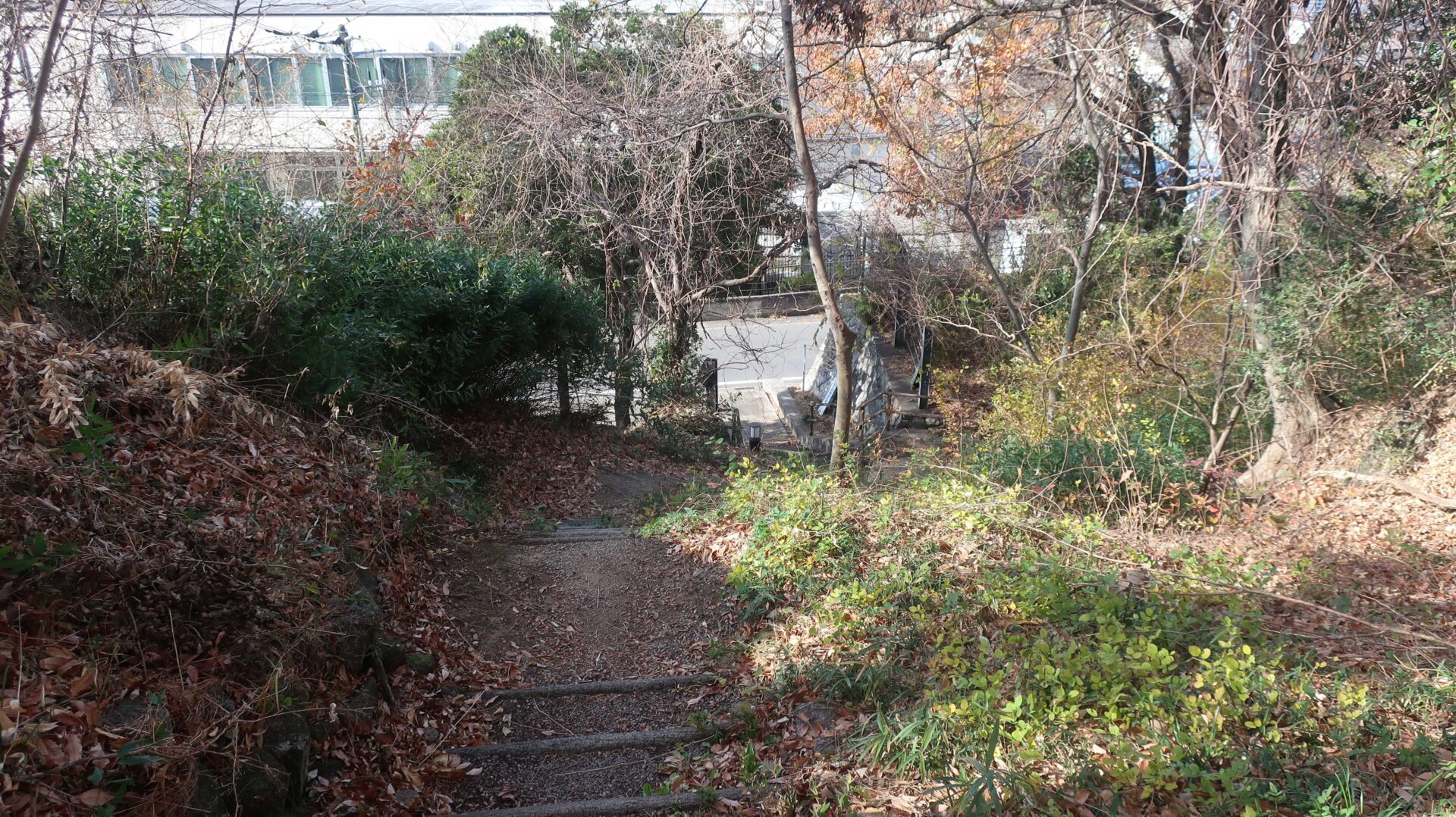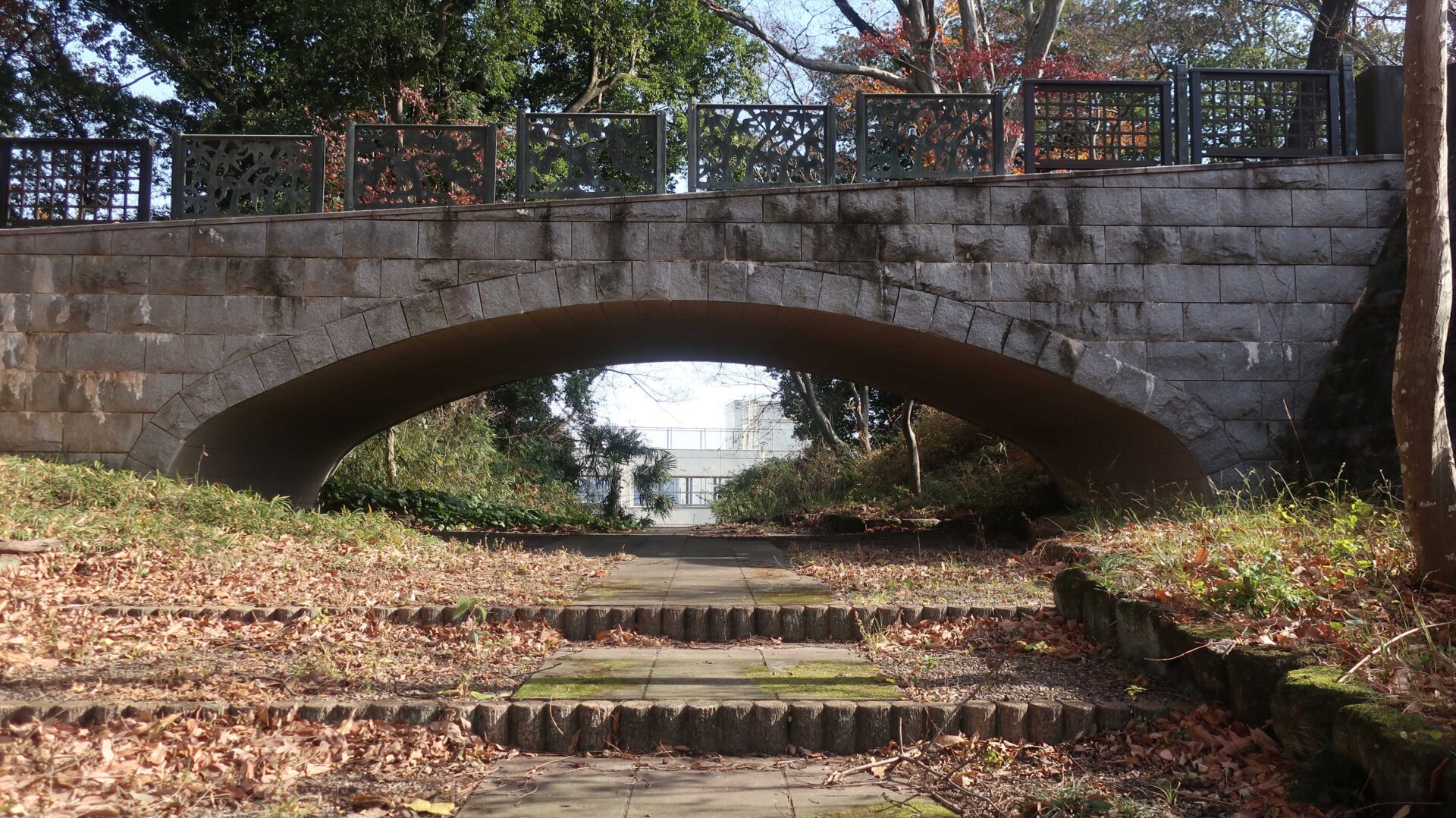この橋の手前、右側を降りる階段がある。見上げるとこんな感じ(真ん中)。先ほど見えた橋