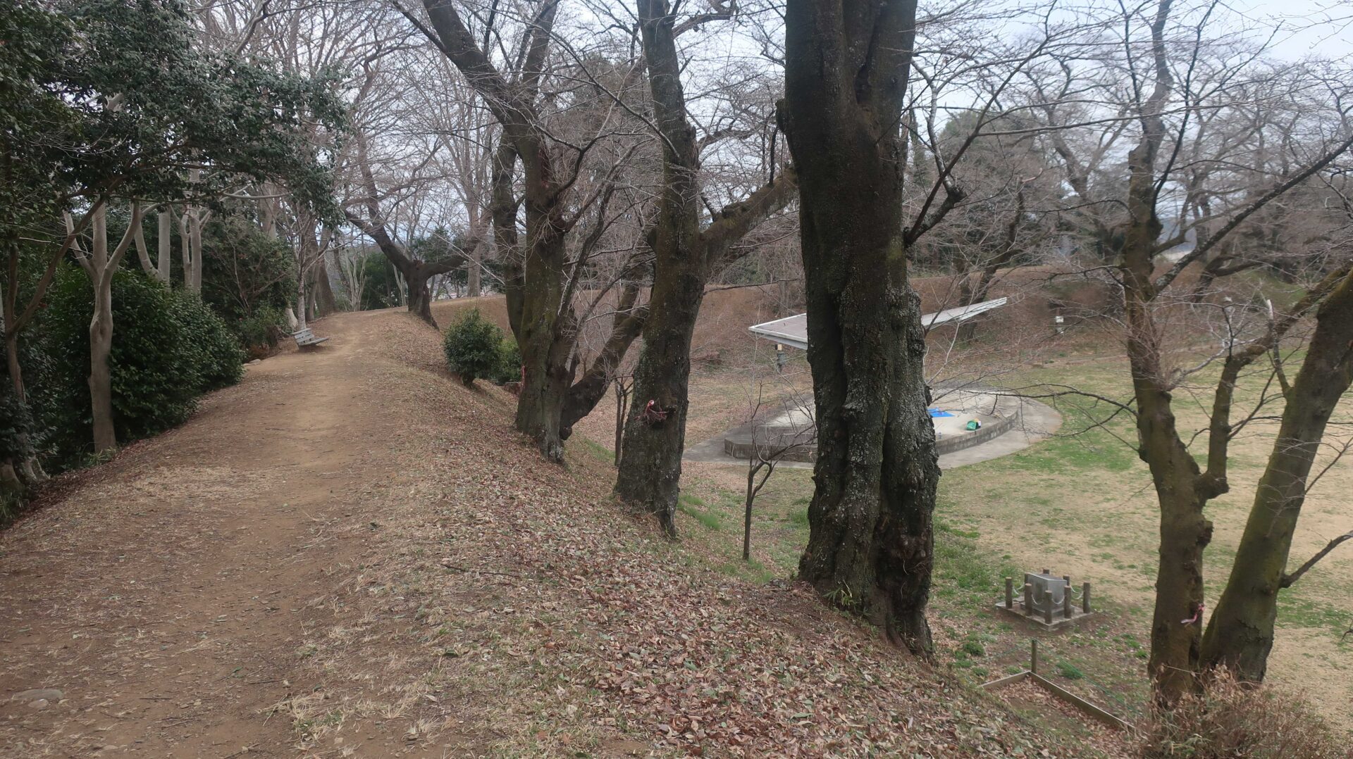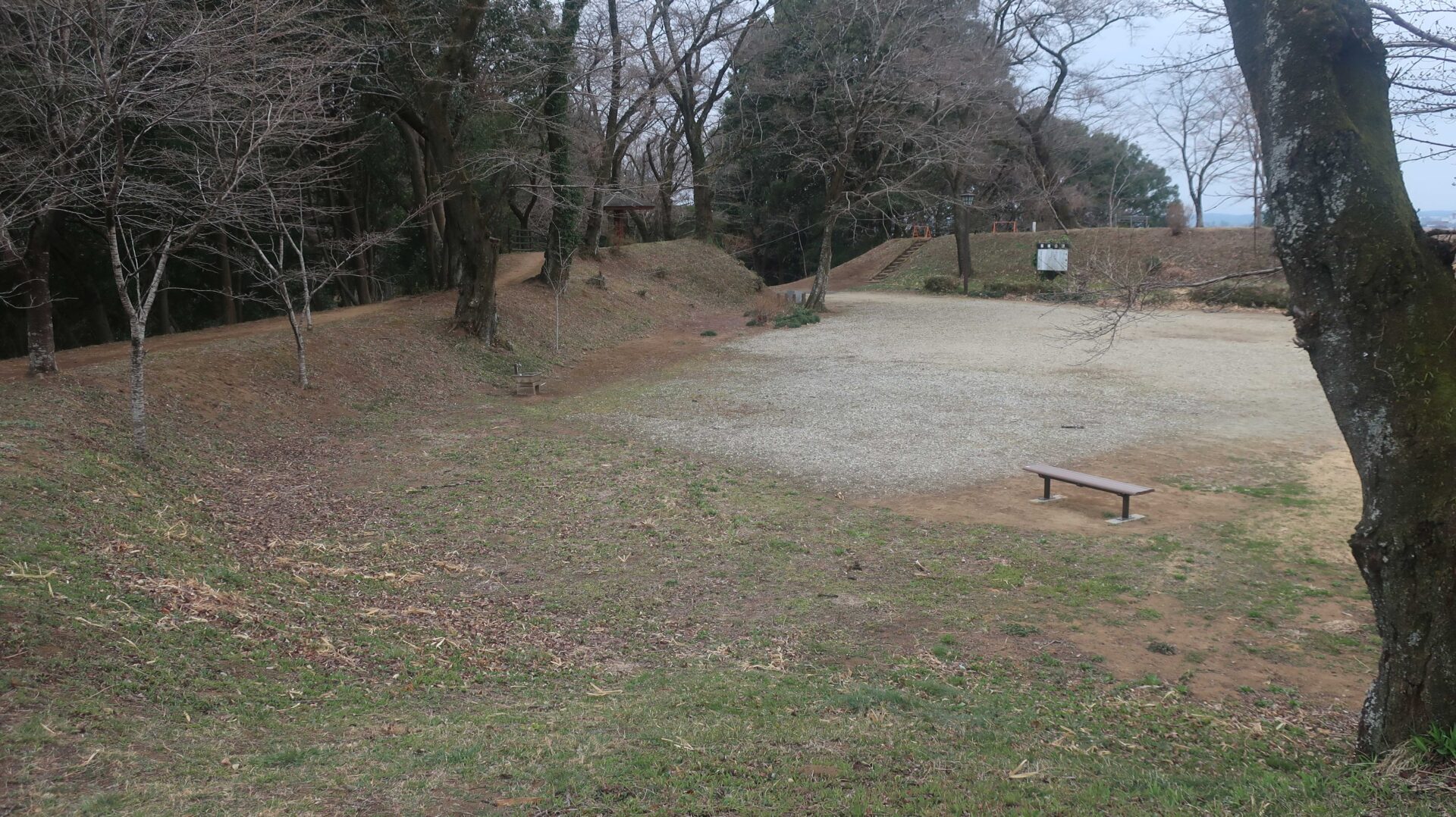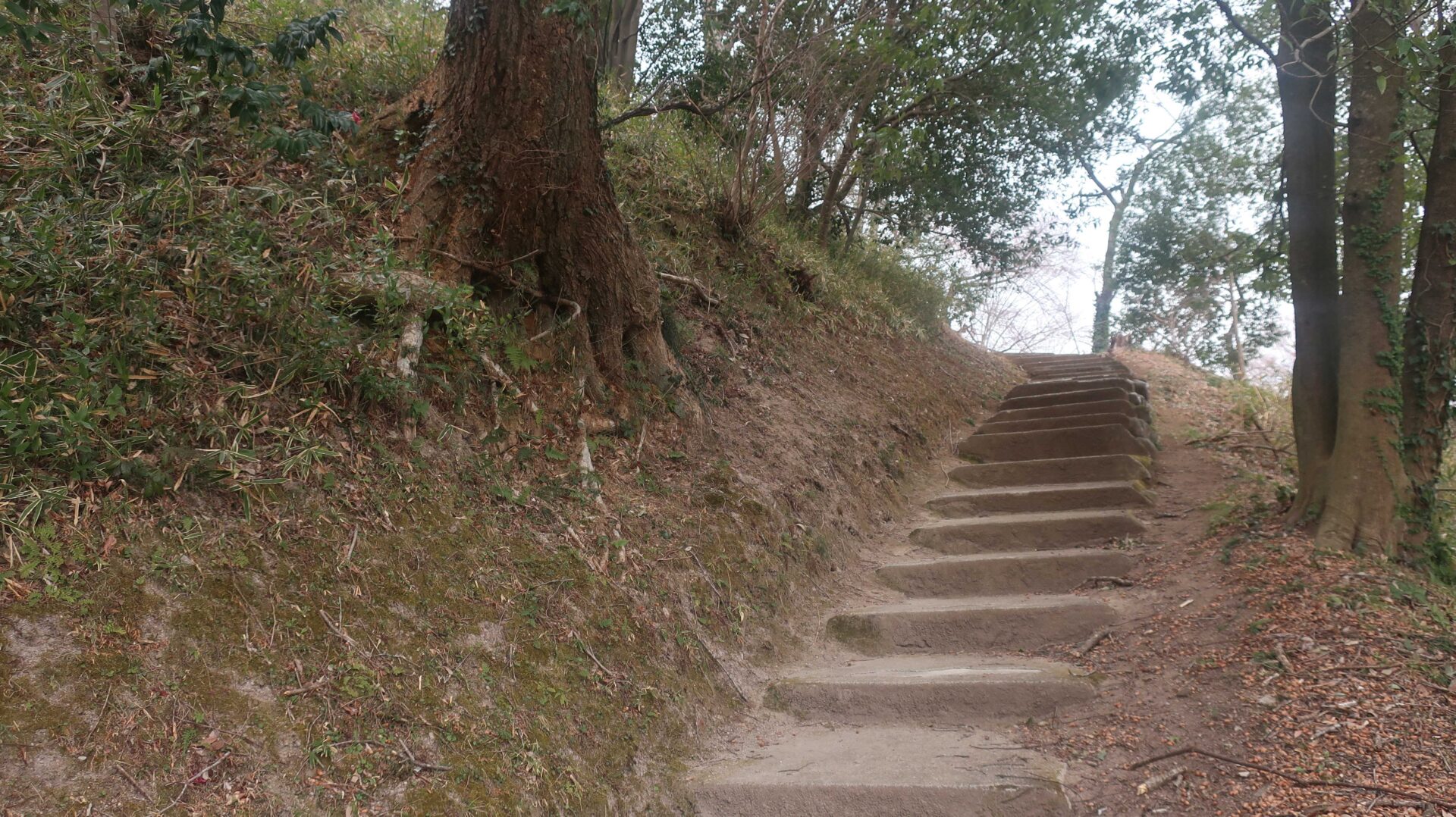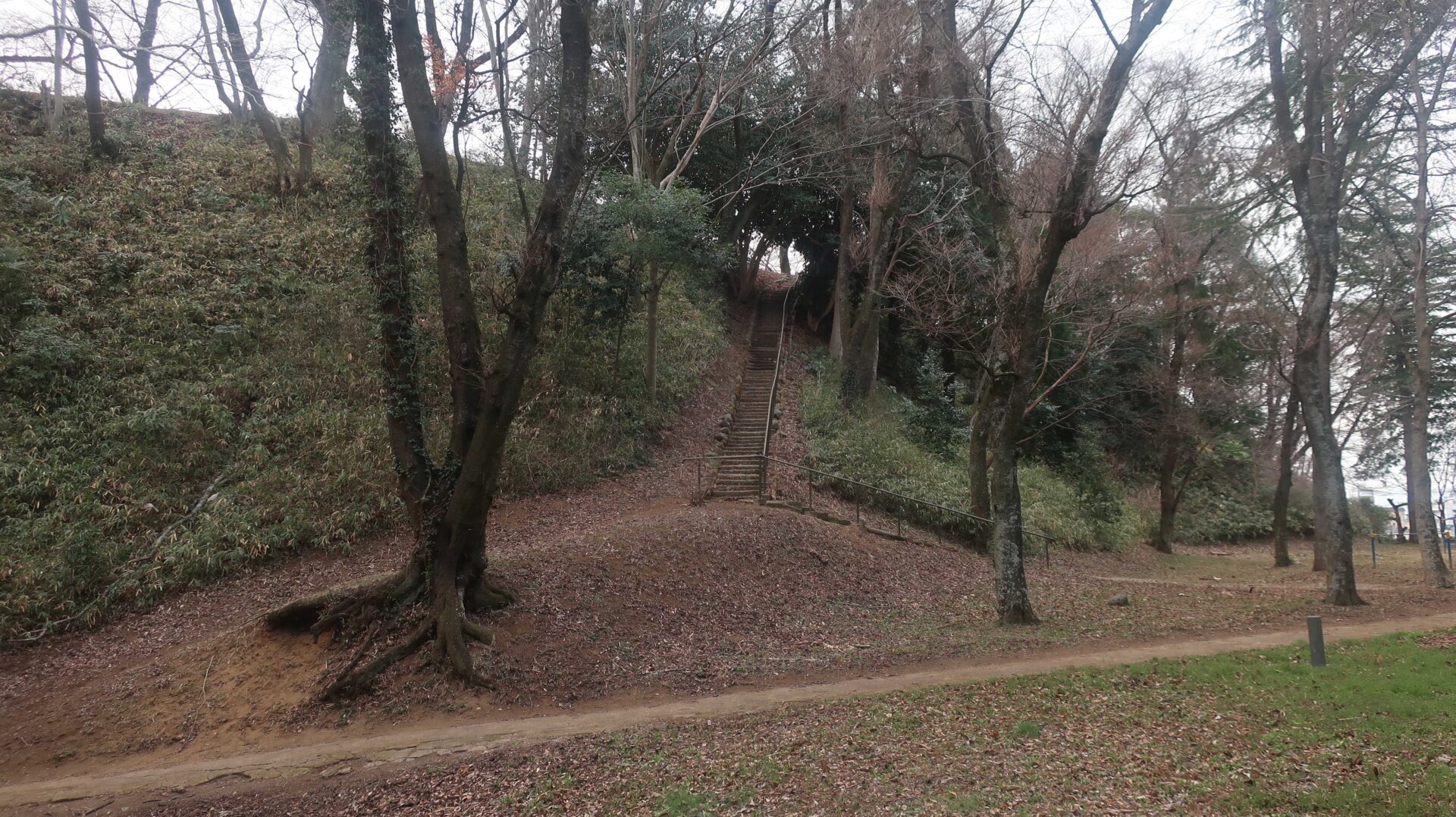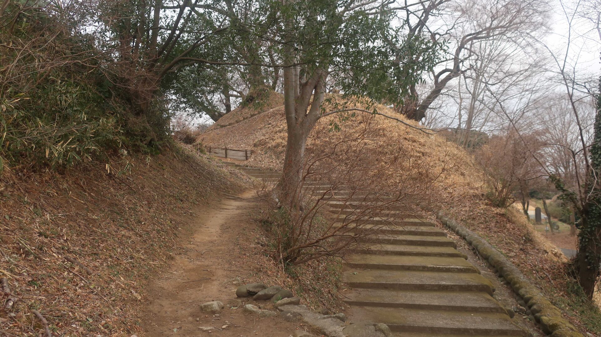 まずは土塁の上を歩く。奥に行くと登る階段が出てくるがここは急である