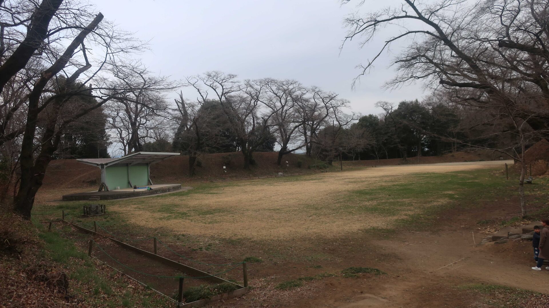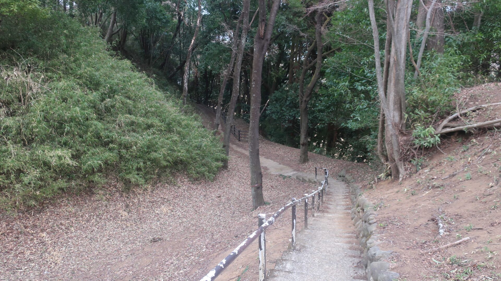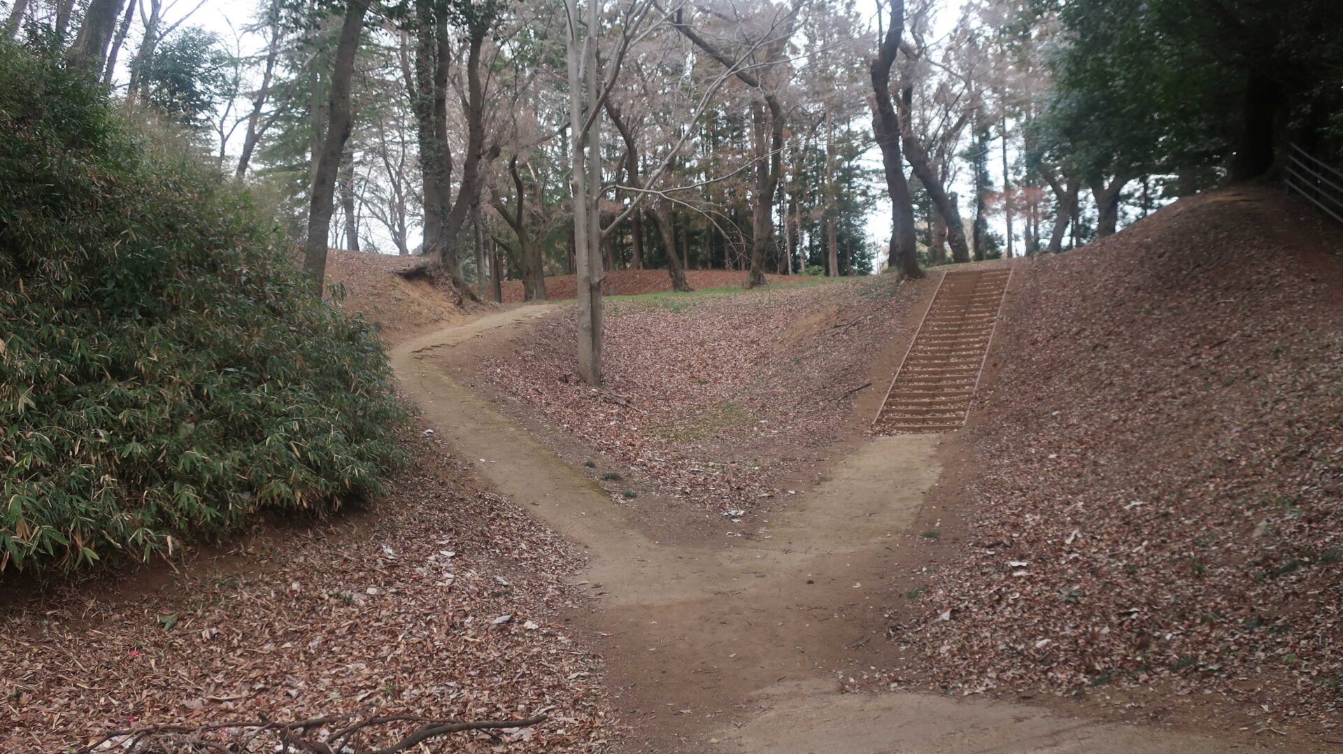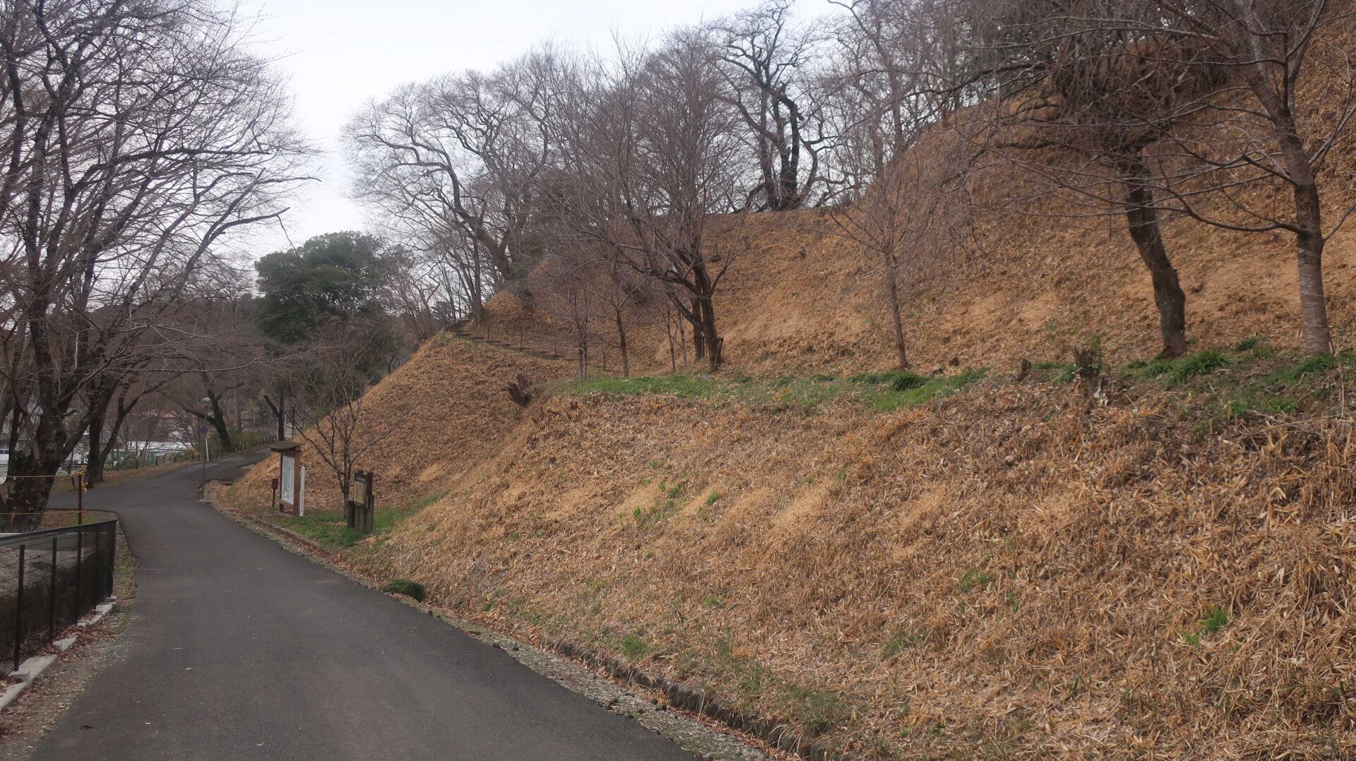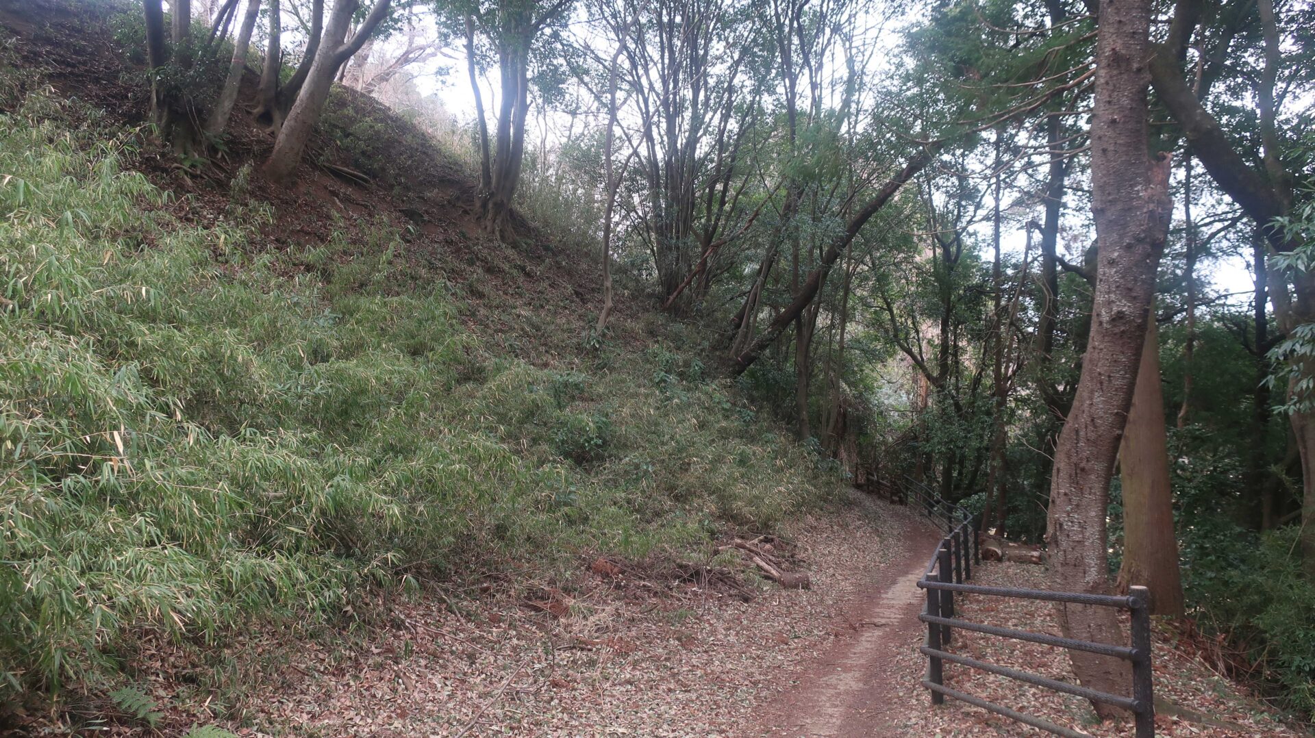 まずは土塁の上を歩く。奥に行くと登る階段が出てくるがここは急である