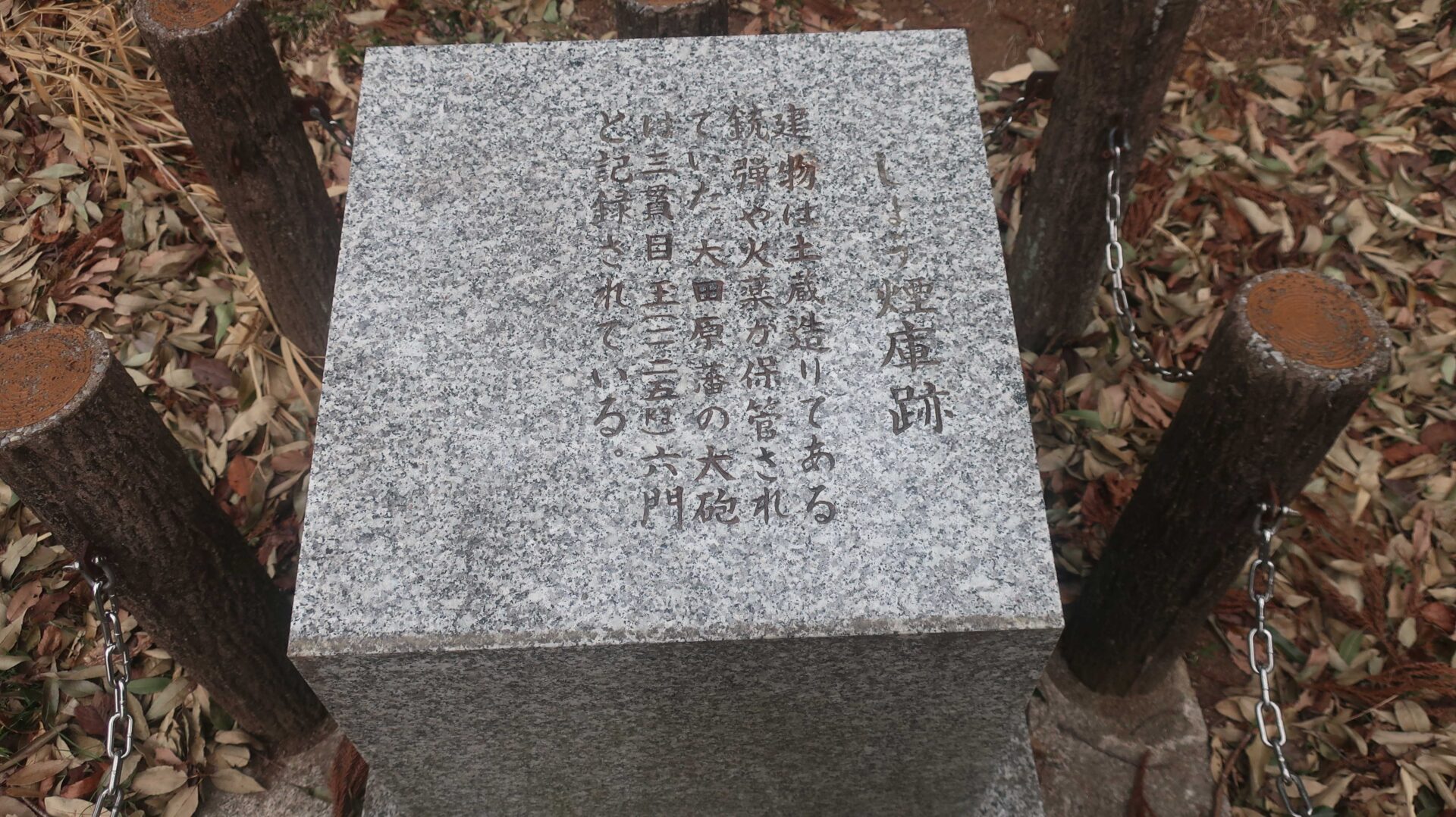 そこには、千石倉跡。場所は二段上の左の写真。二の丸跡に戻りしょう煙庫跡を見て、堀の底を歩ける道へ