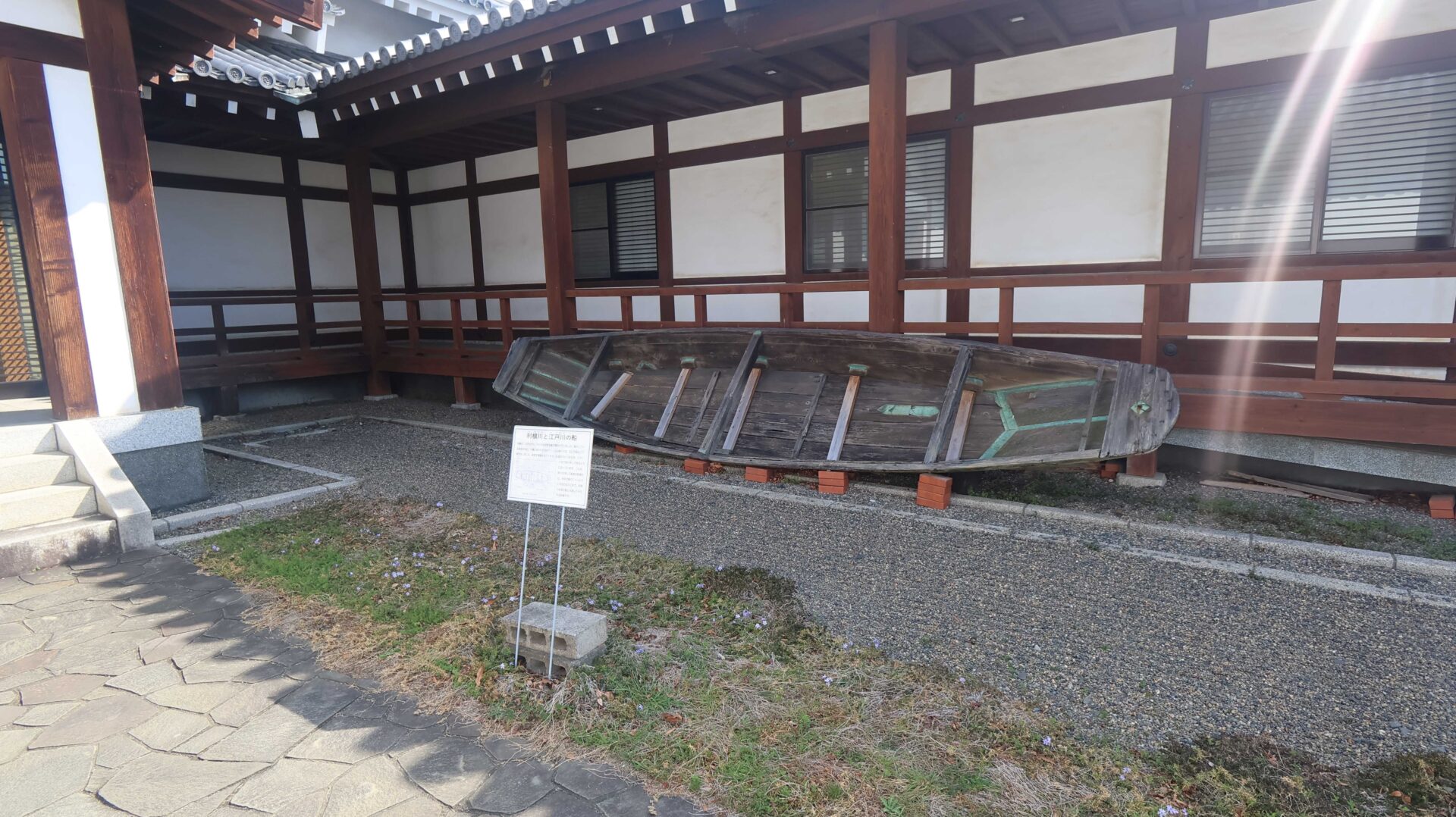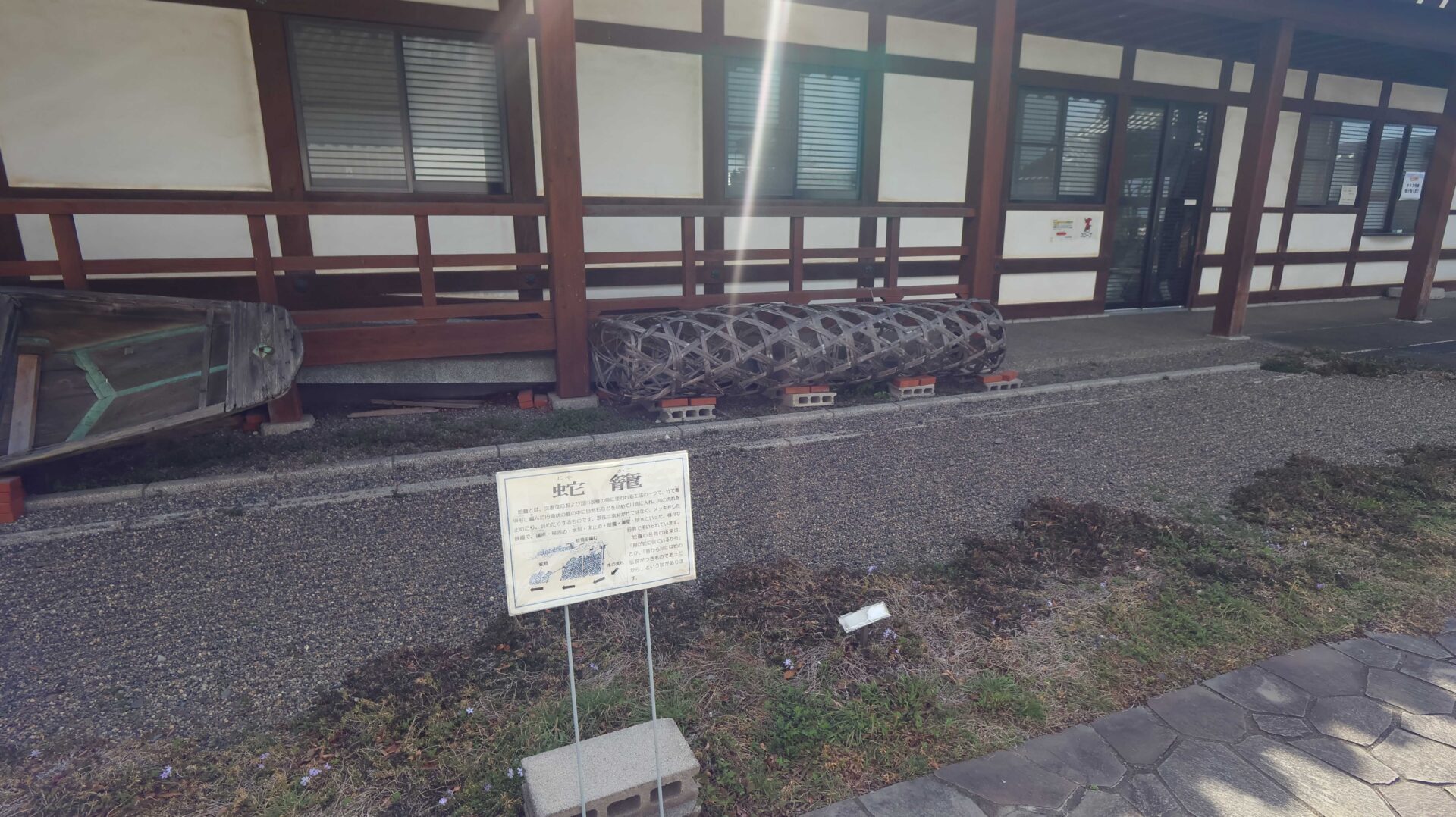 博物館入口には蛇篭と船が展示されている