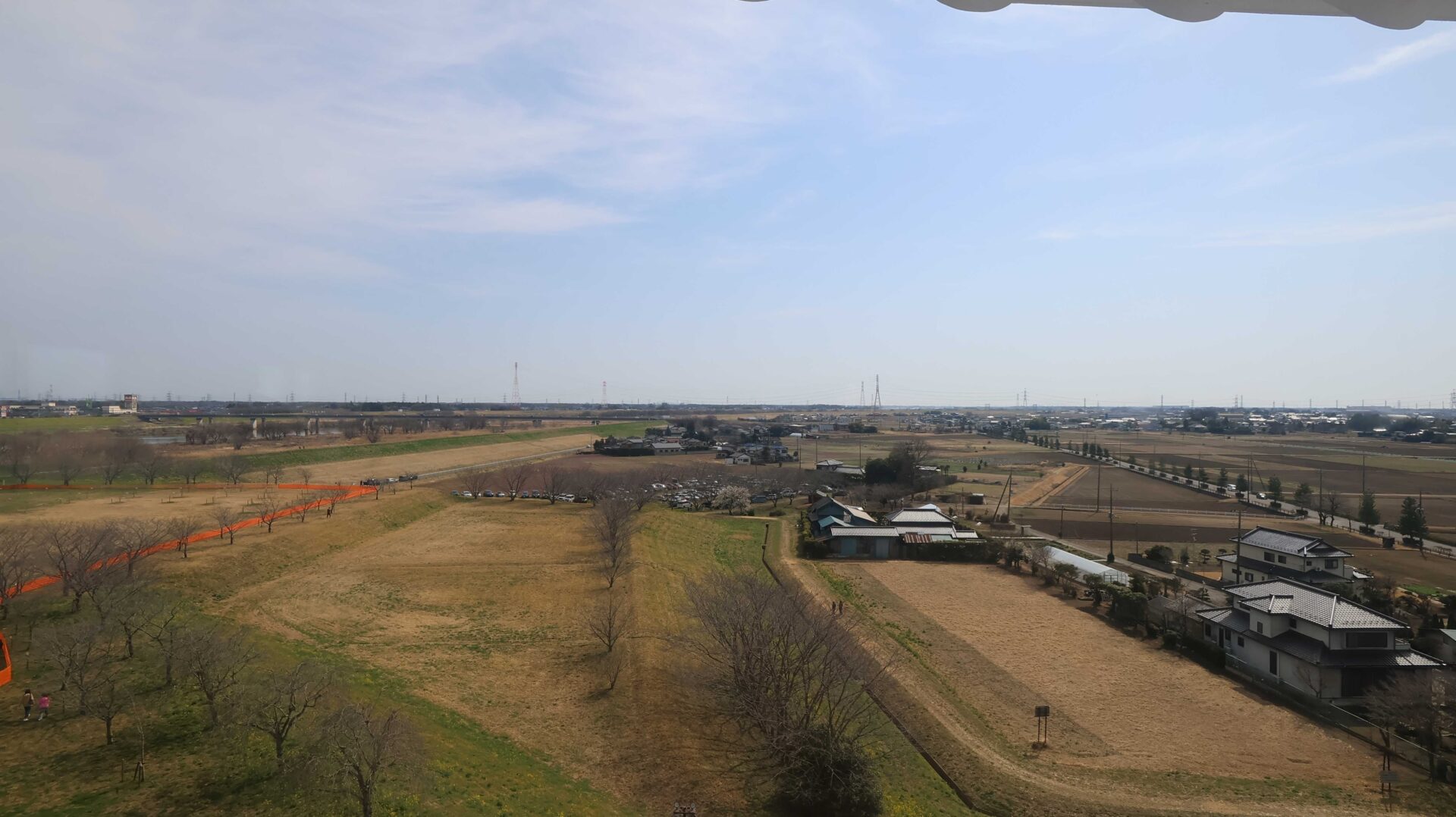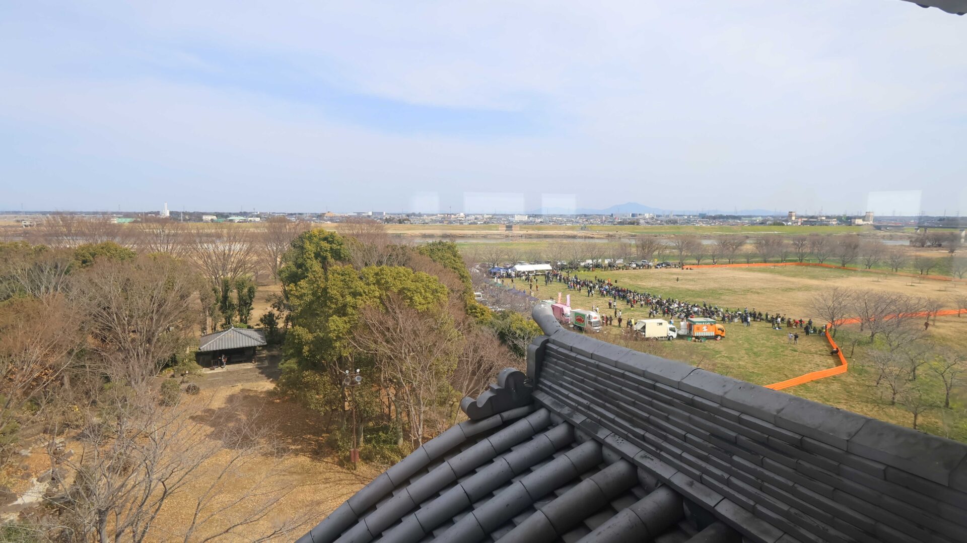 一番上からの眺め。意外と何もないので昔と変わらない?川の流れはもっと近かったようでもあるが。ちなみに鳥のフライトショーのイベントが開催されていた。