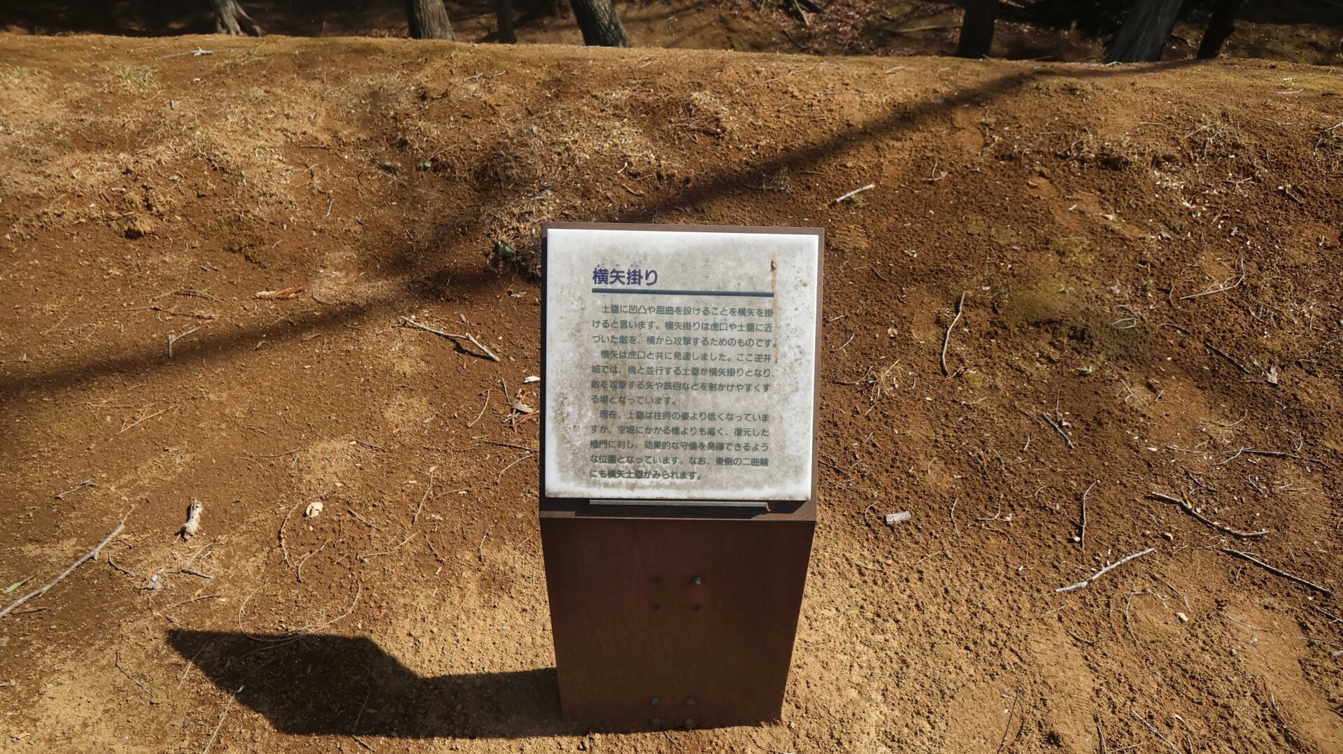 平地と平地の間に堀。比高二重土塁となっている