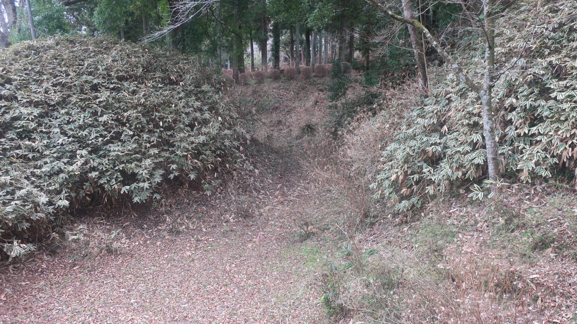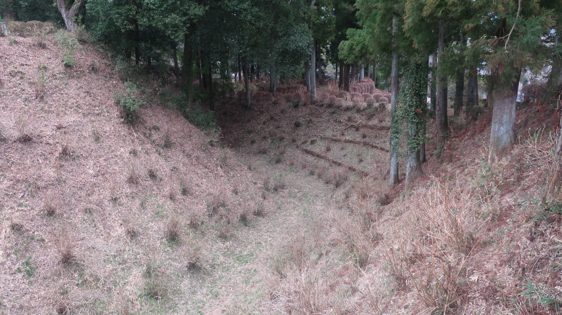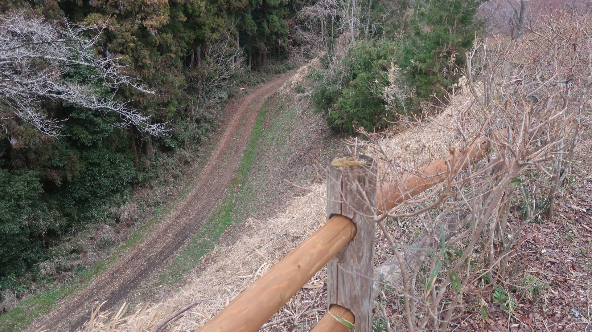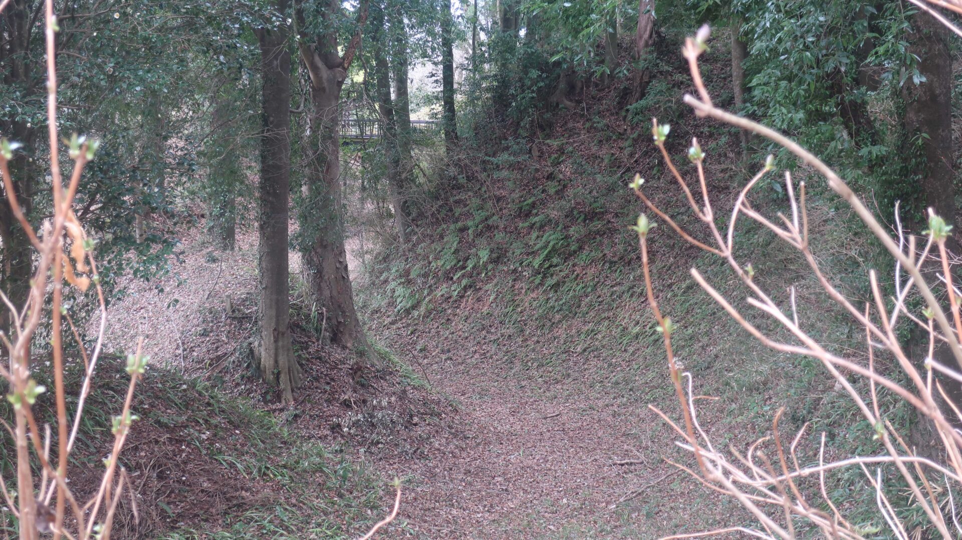 先ほど館をくぐったときにみた堀に道が続いていたのでそこを下ってみることに。いやあかなり急である。下りだから良いものの