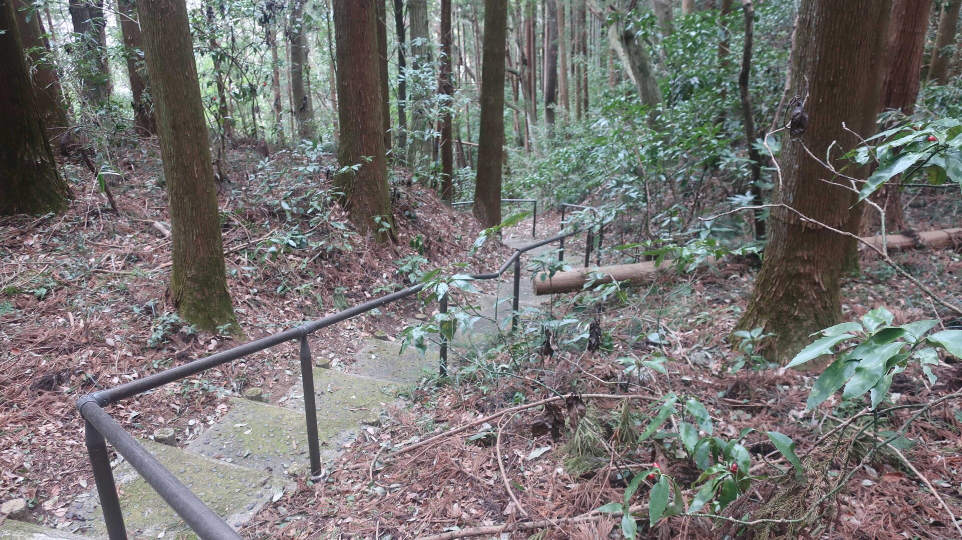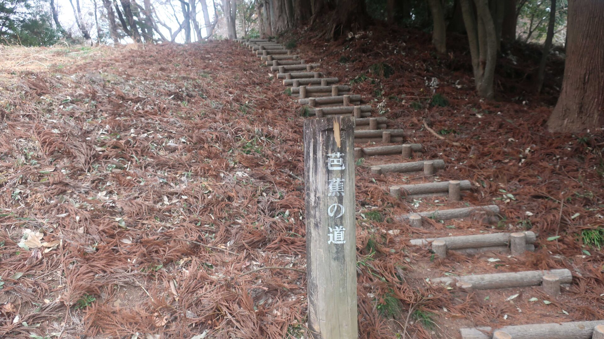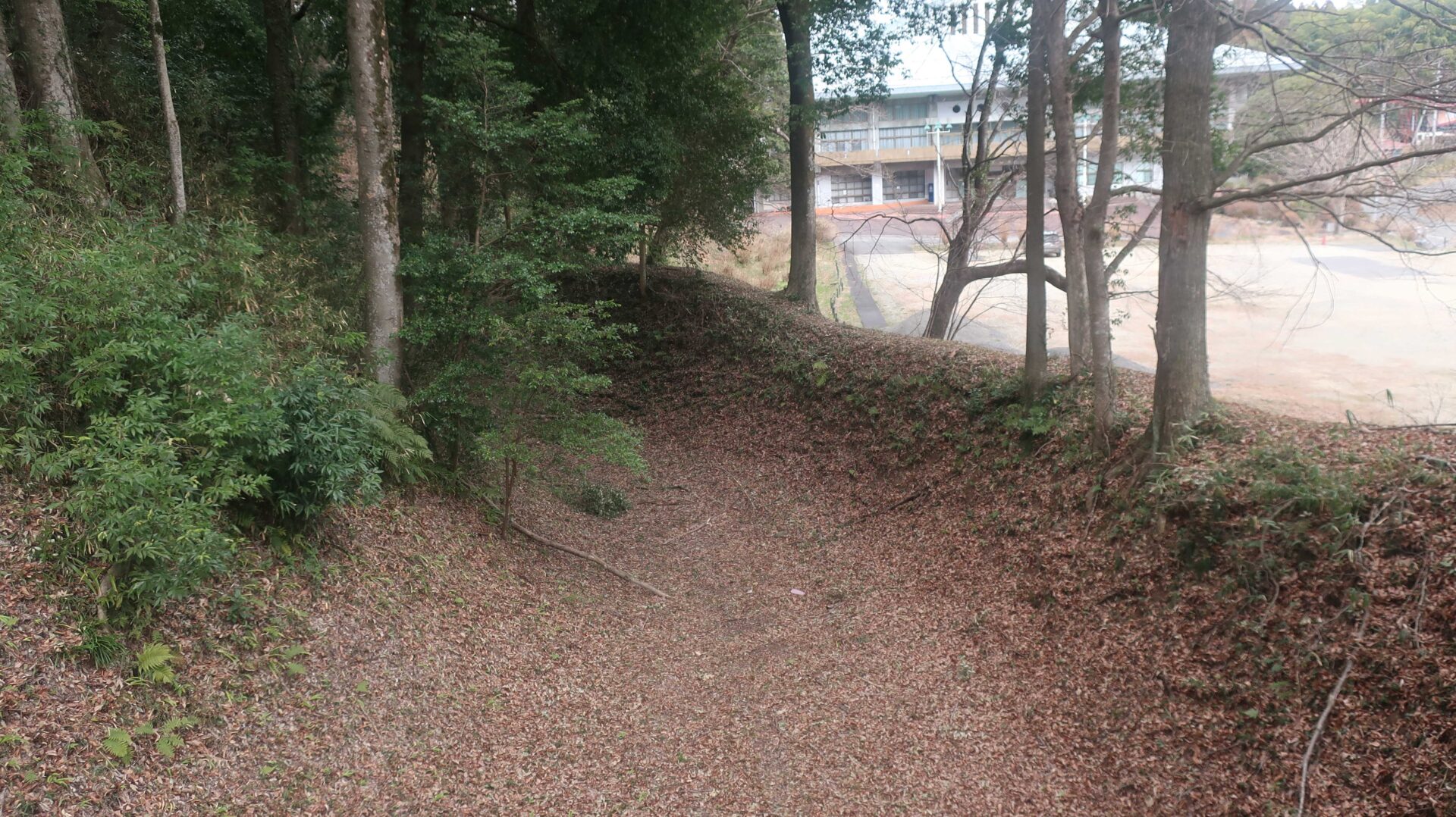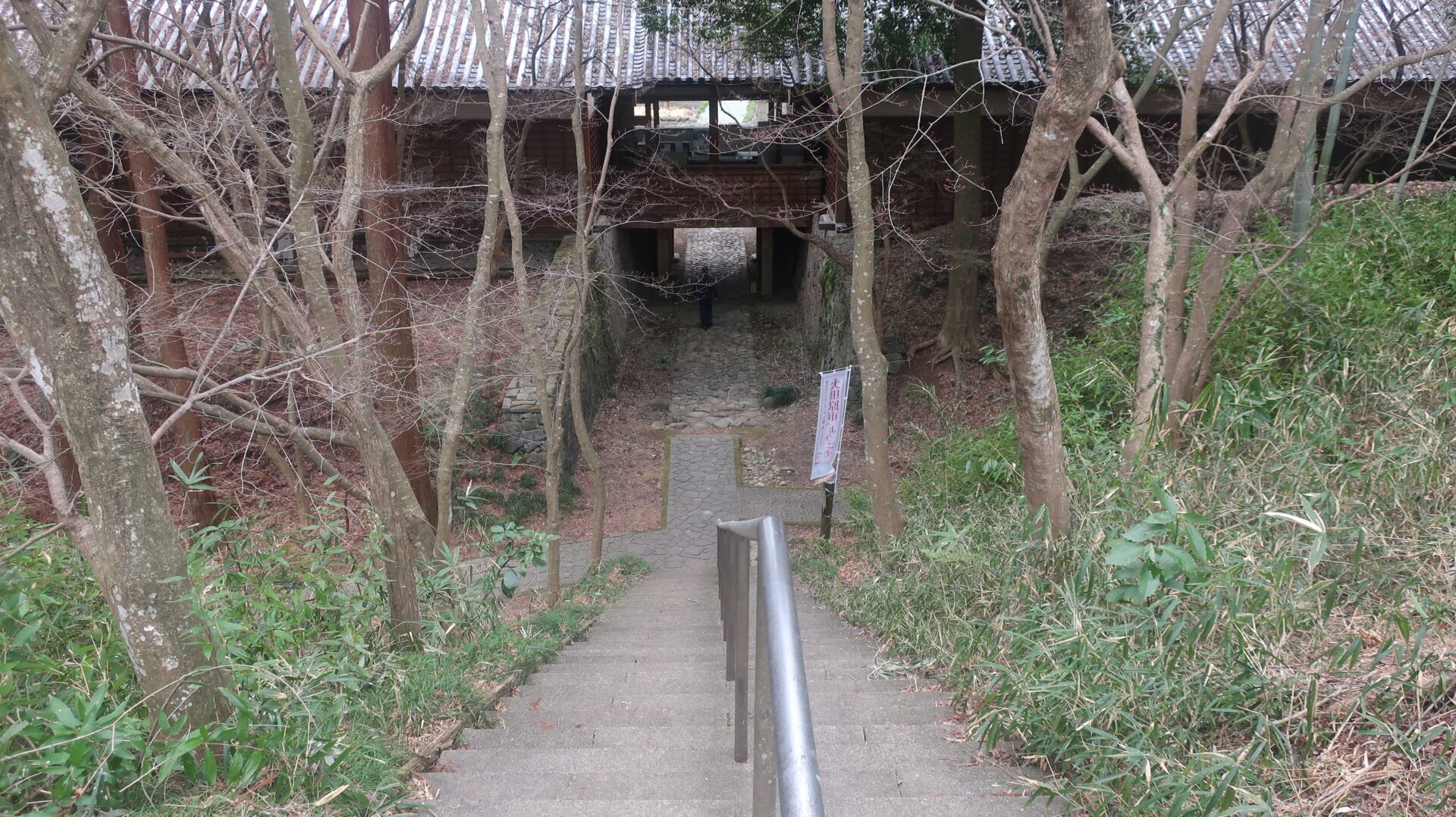先ほど館をくぐったときにみた堀に道が続いていたのでそこを下ってみることに。いやあかなり急である。下りだから良いものの