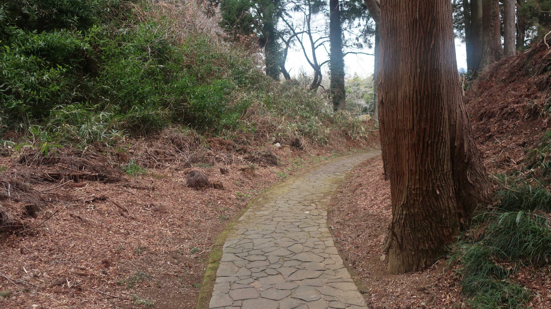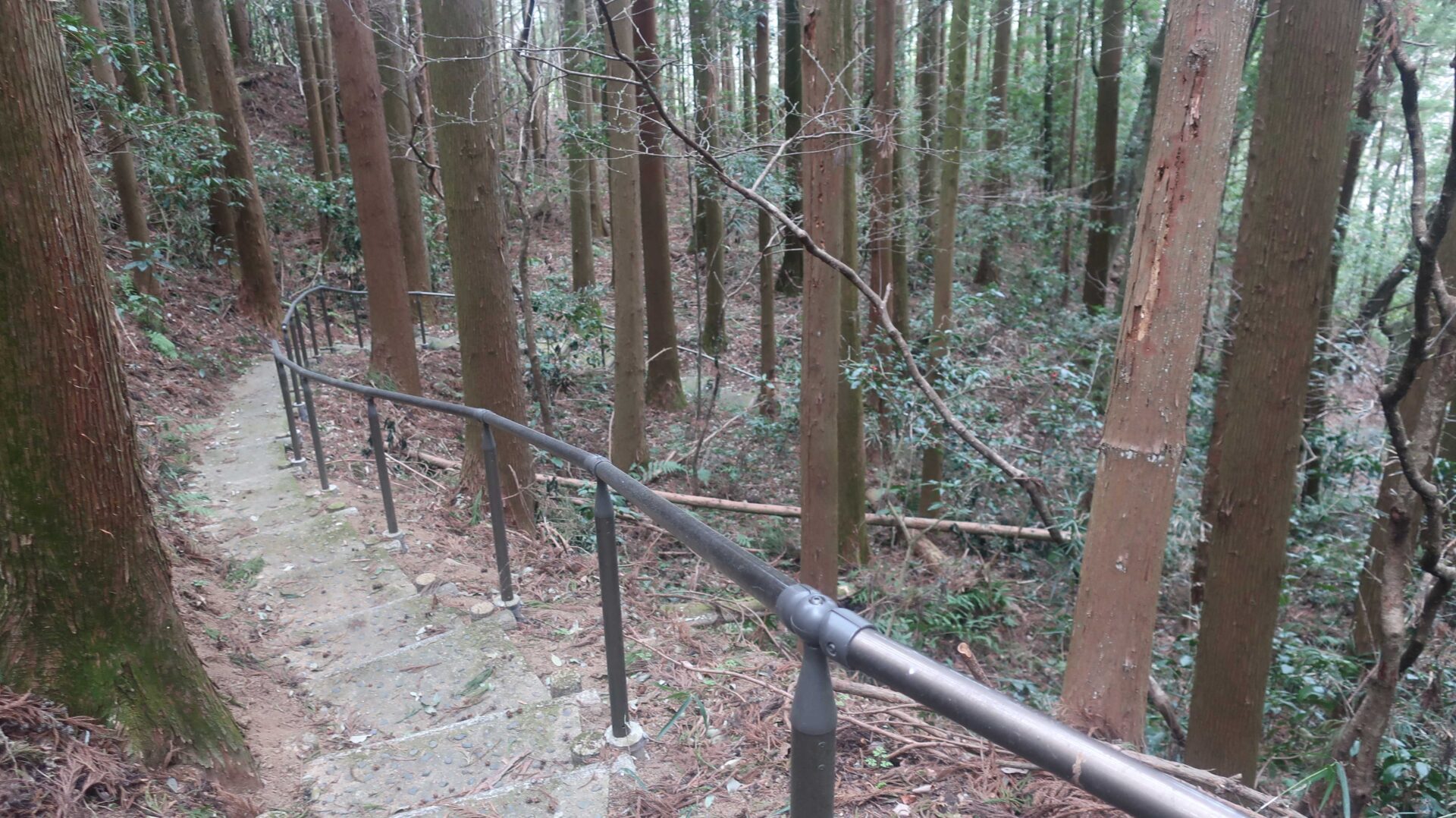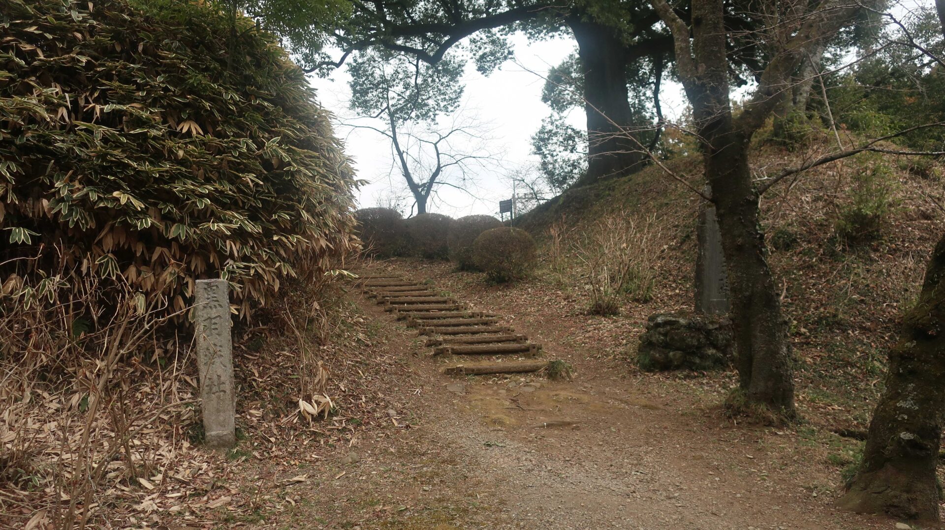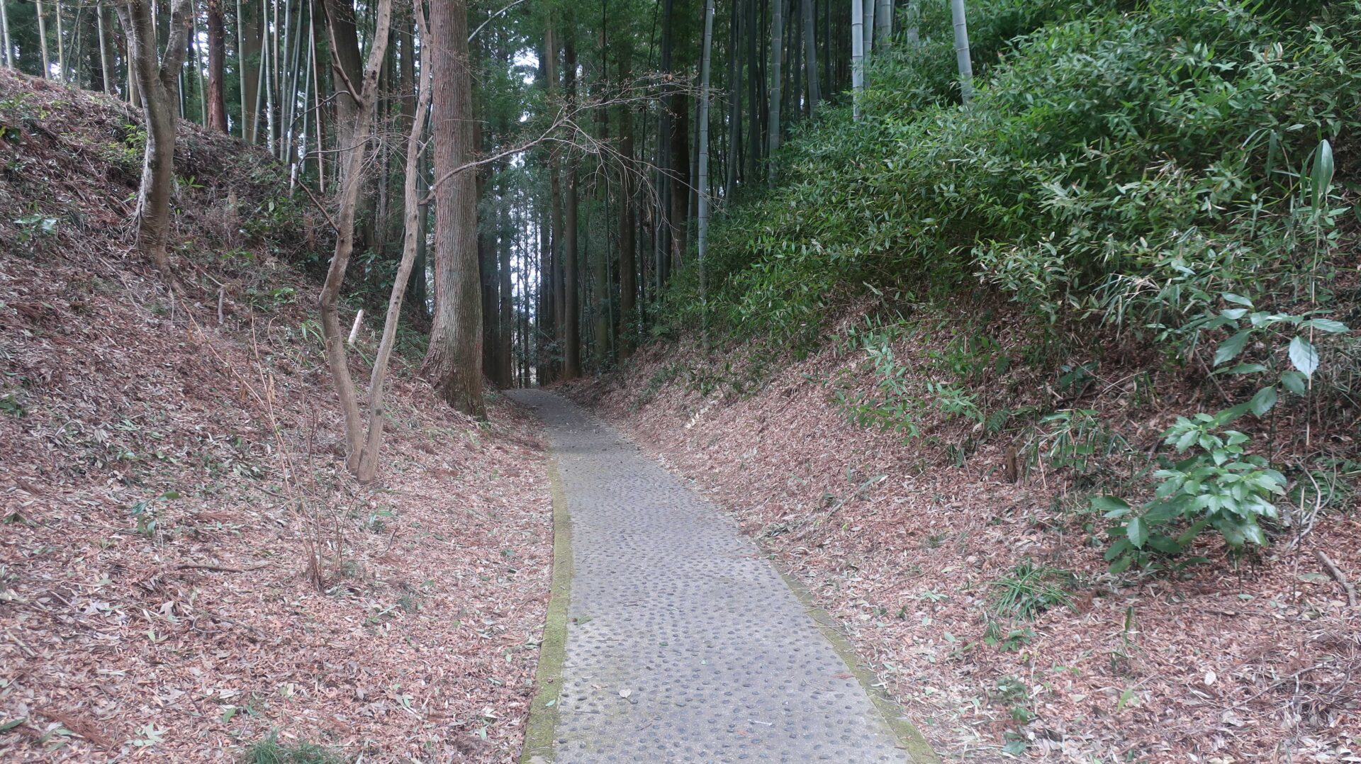 先ほど館をくぐったときにみた堀に道が続いていたのでそこを下ってみることに。いやあかなり急である。下りだから良いものの
