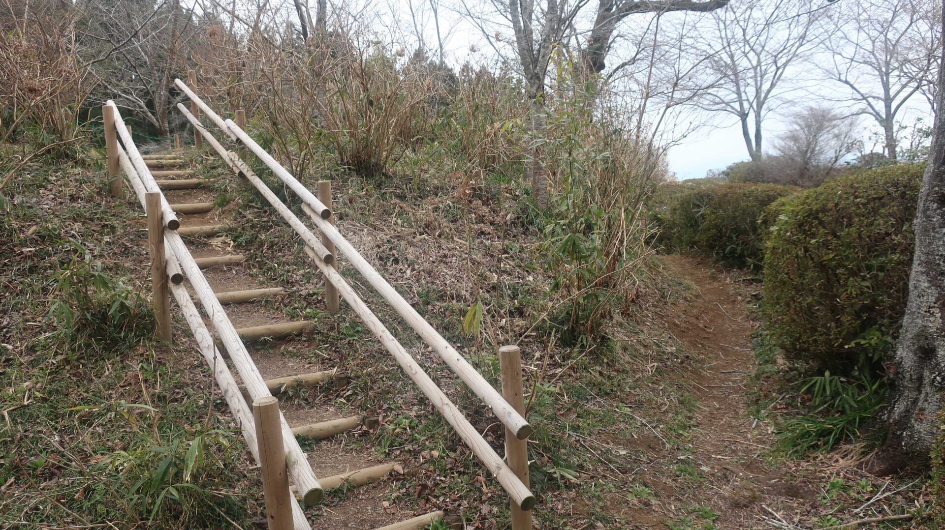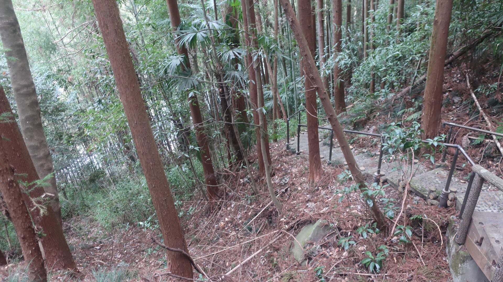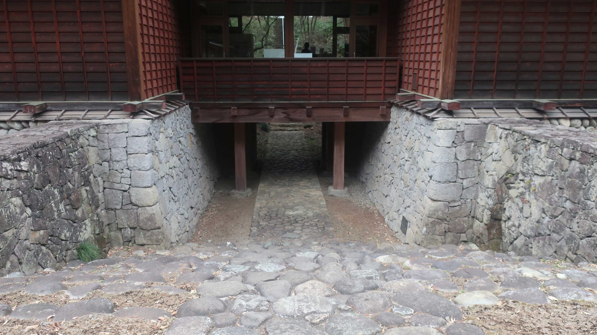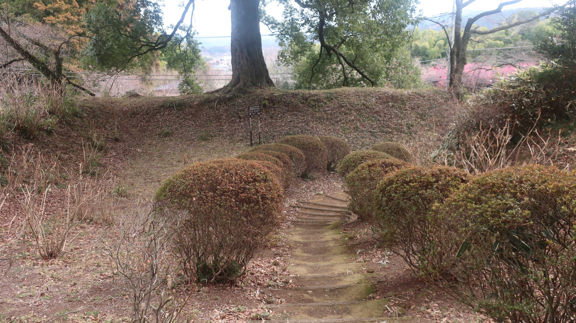 先ほど館をくぐったときにみた堀に道が続いていたのでそこを下ってみることに。いやあかなり急である。下りだから良いものの