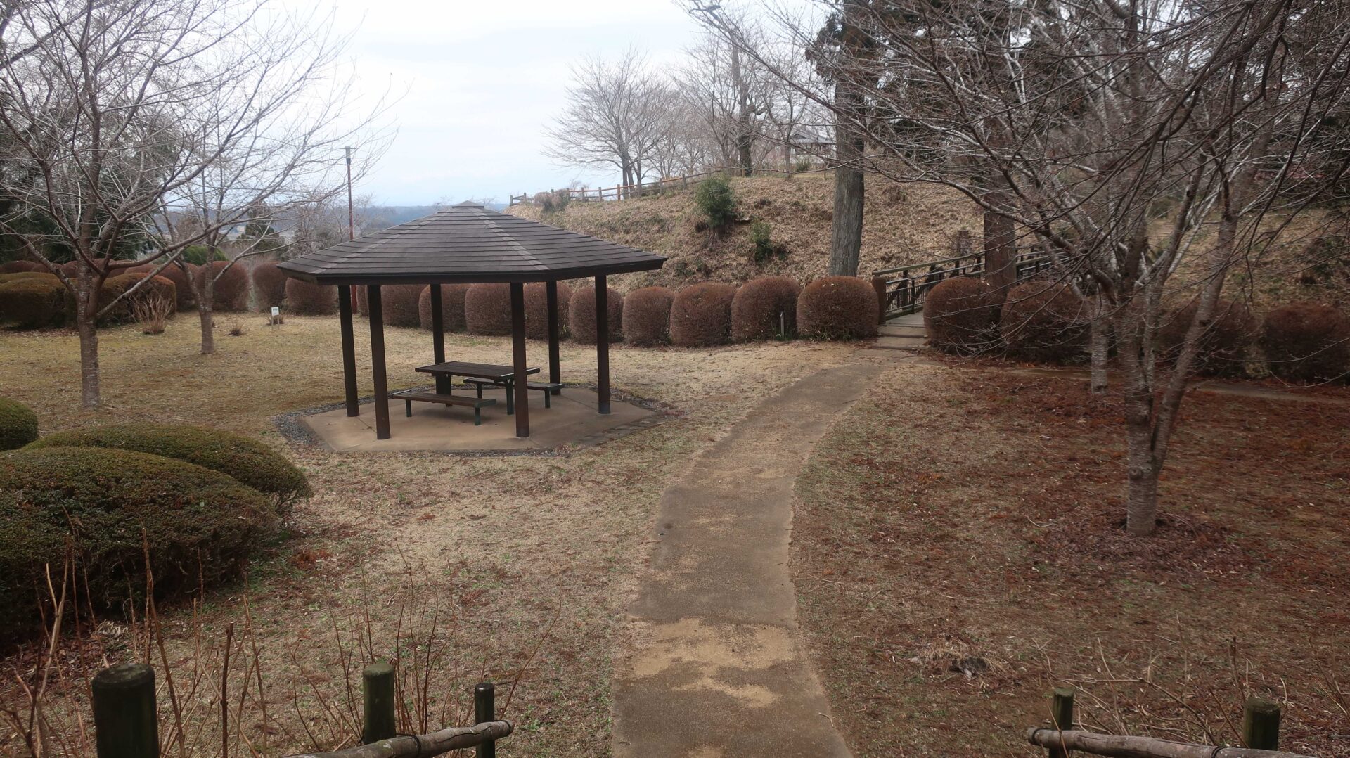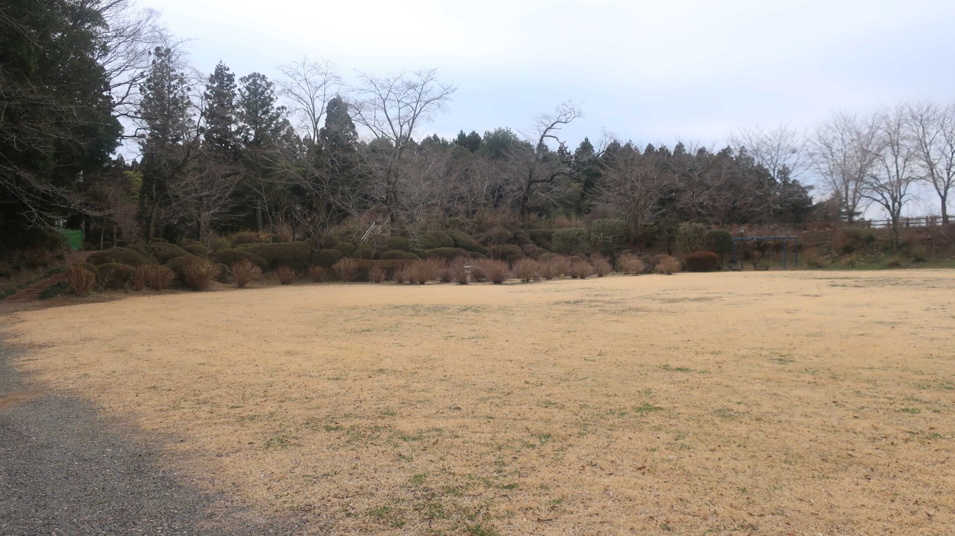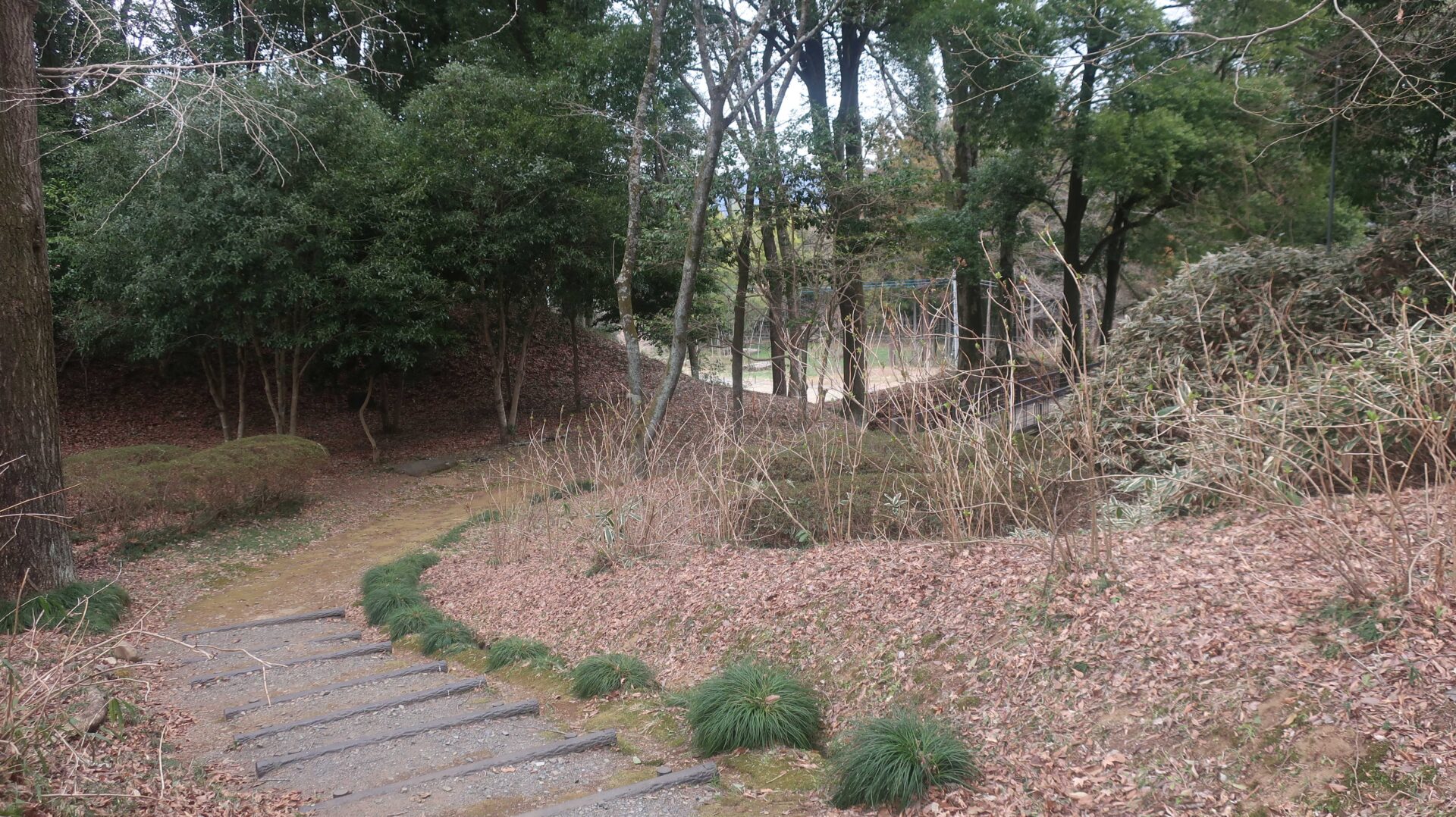 広場を見ると城の案内もある。体育館へ向かう道を下る道