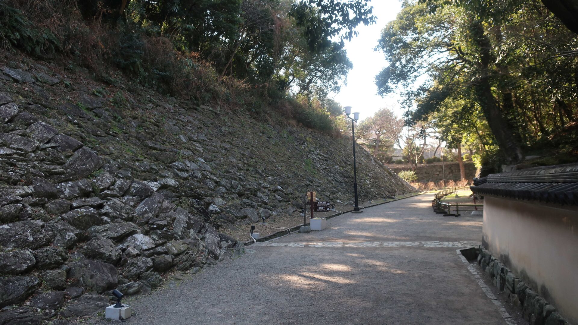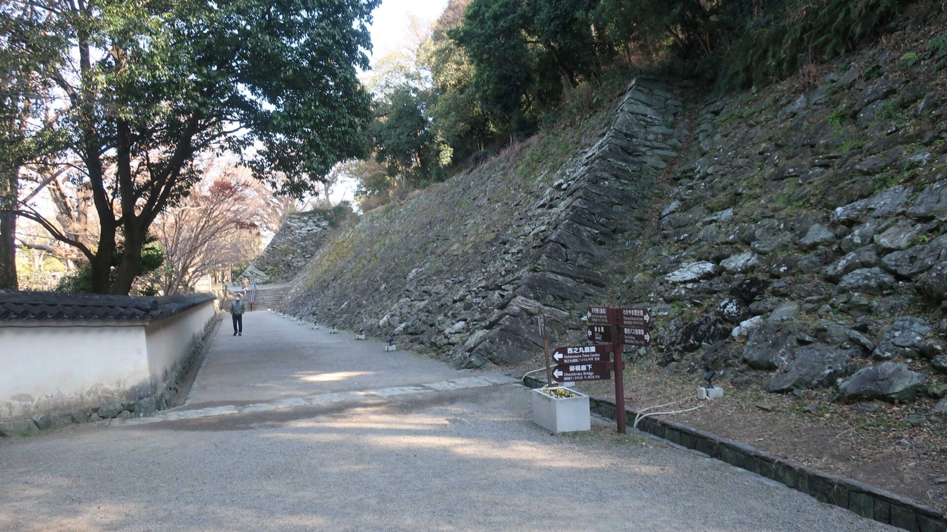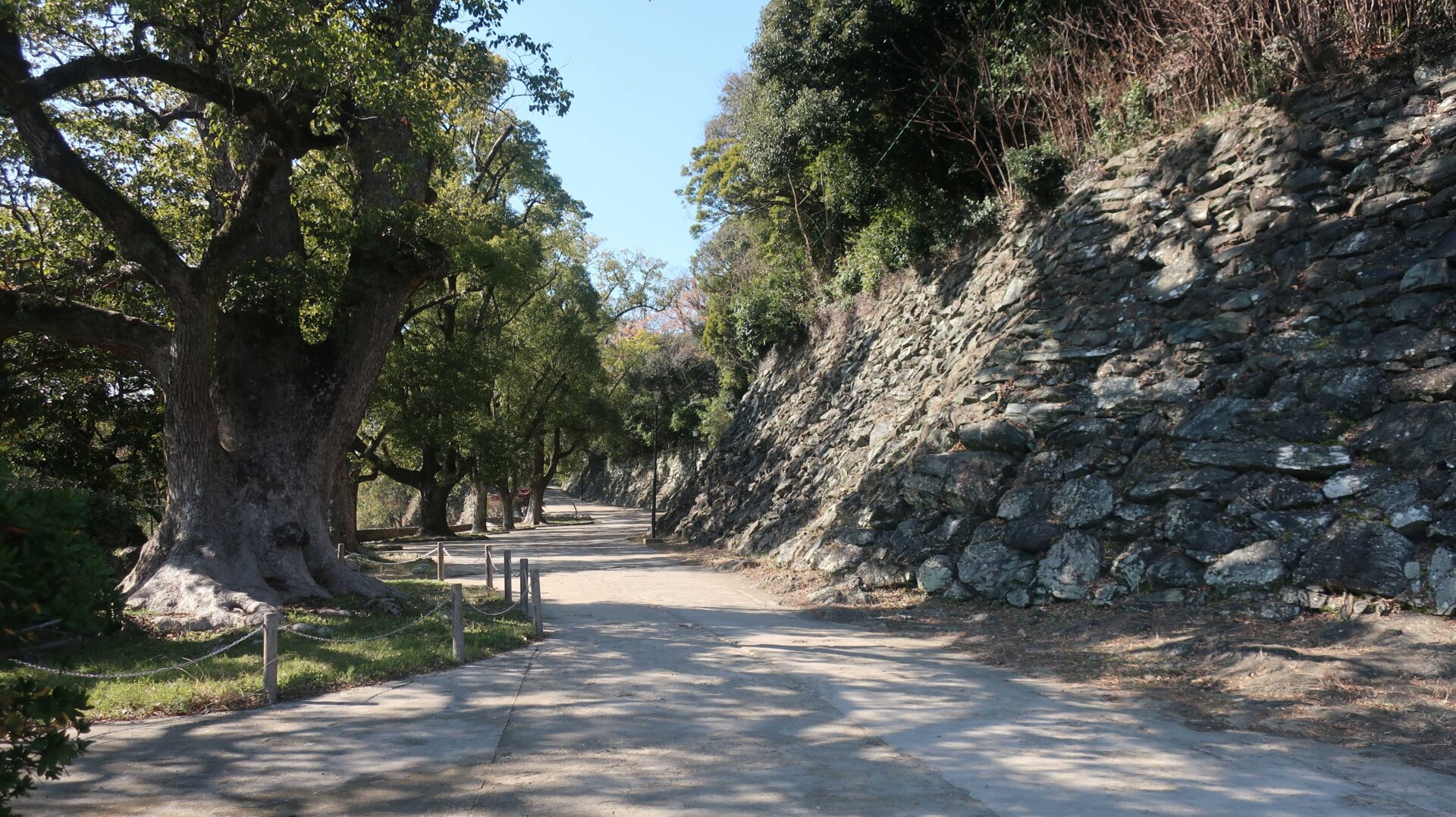 かなり広いので先を急ぐ。振り返るとながーい道。そして石垣が中にも。