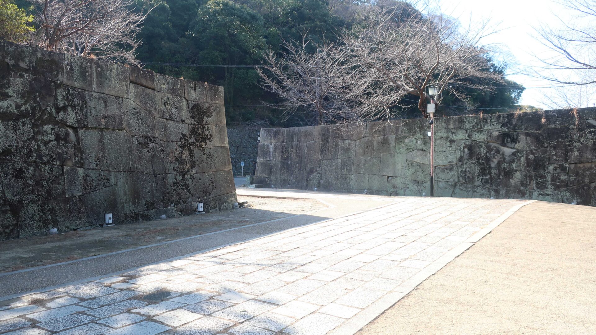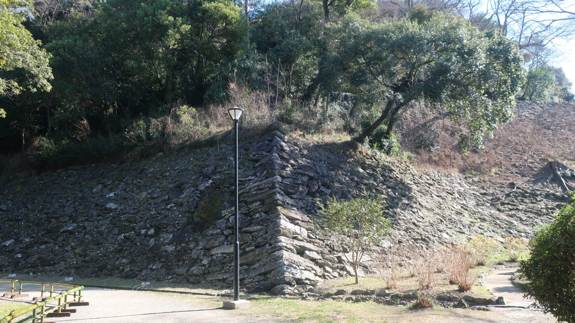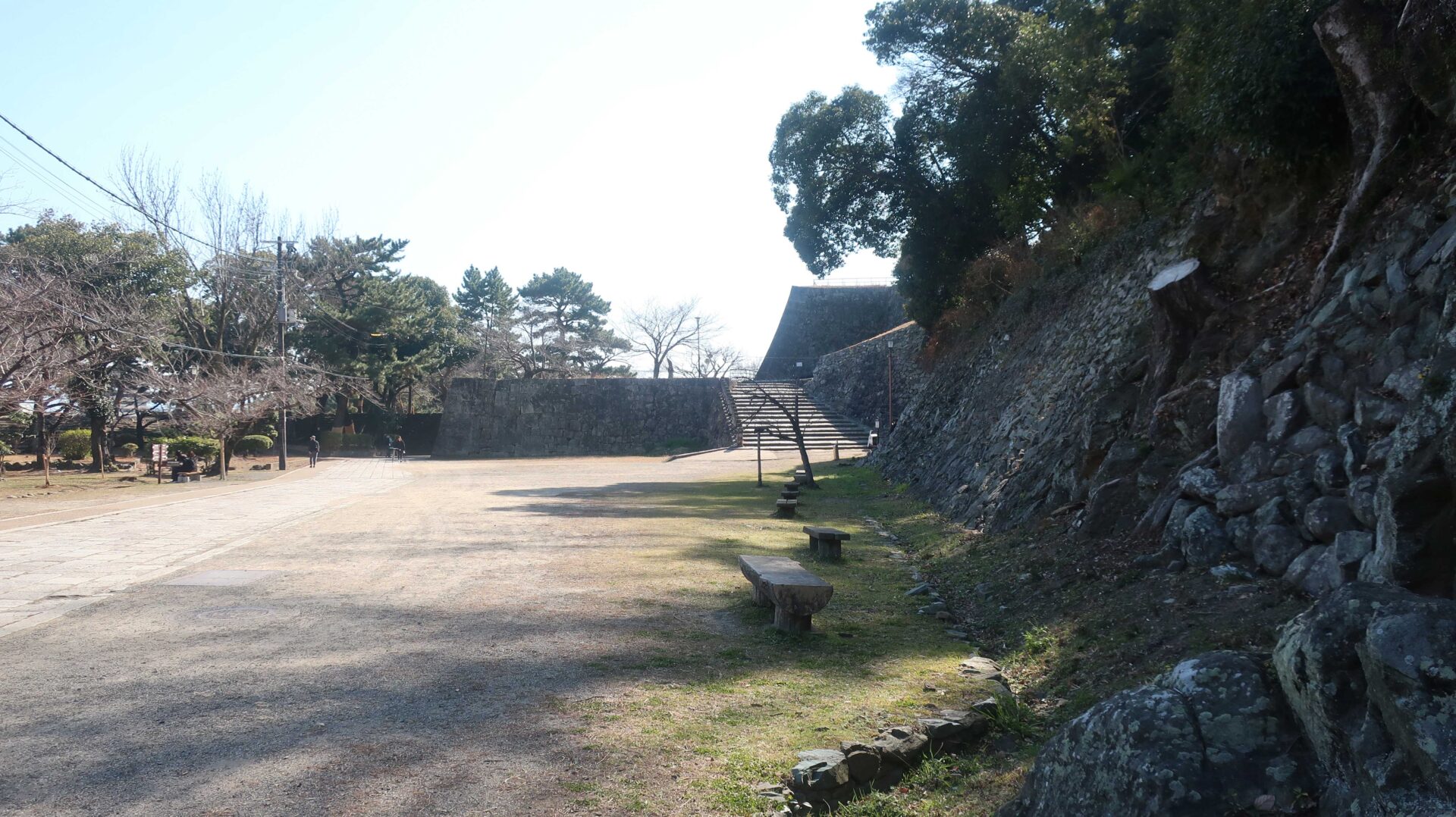 かなり広いので先を急ぐ。振り返るとながーい道。そして石垣が中にも。