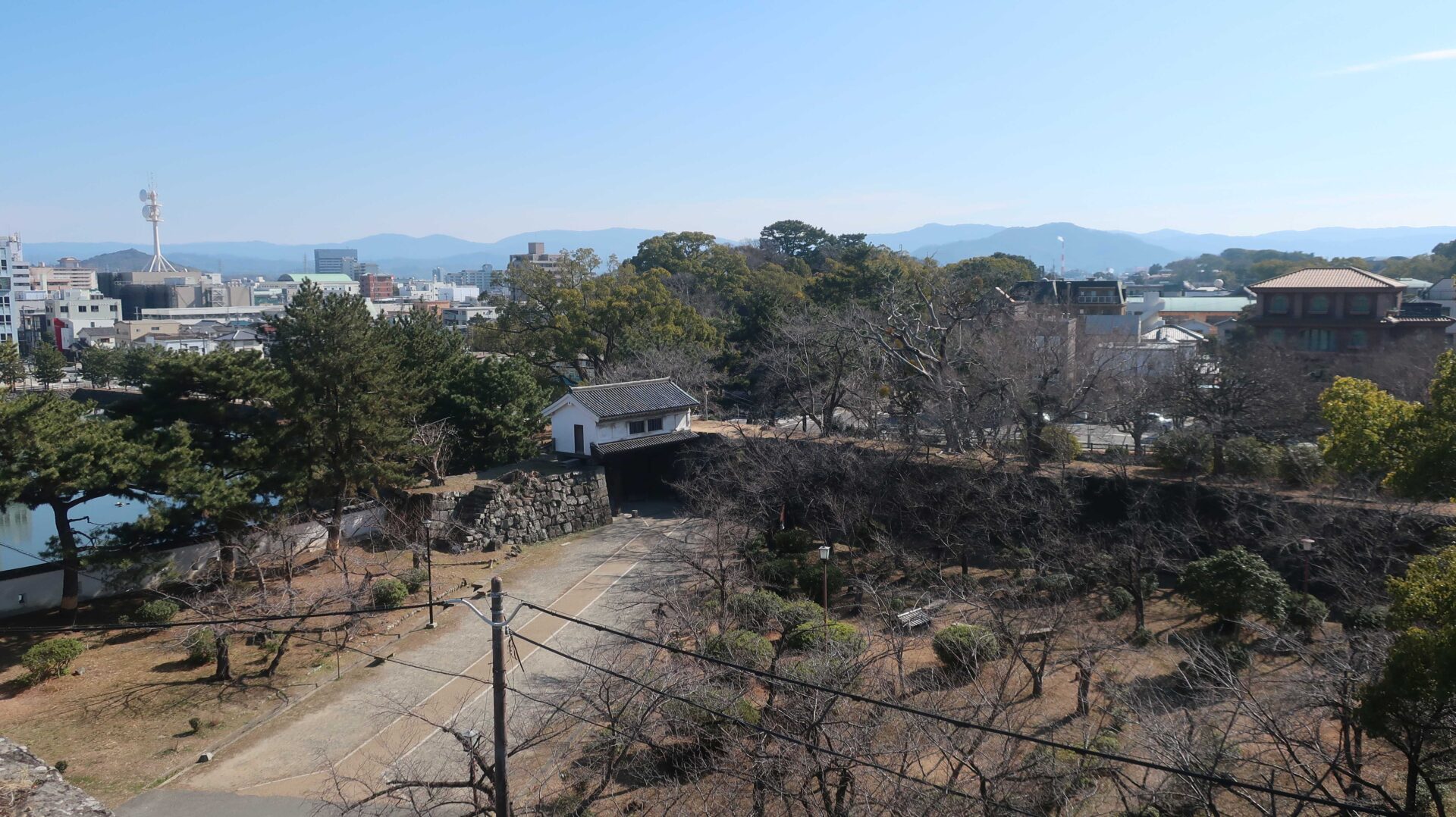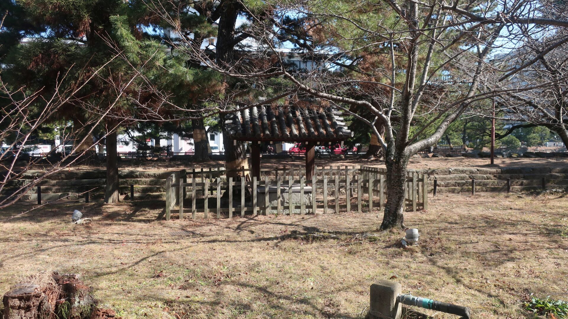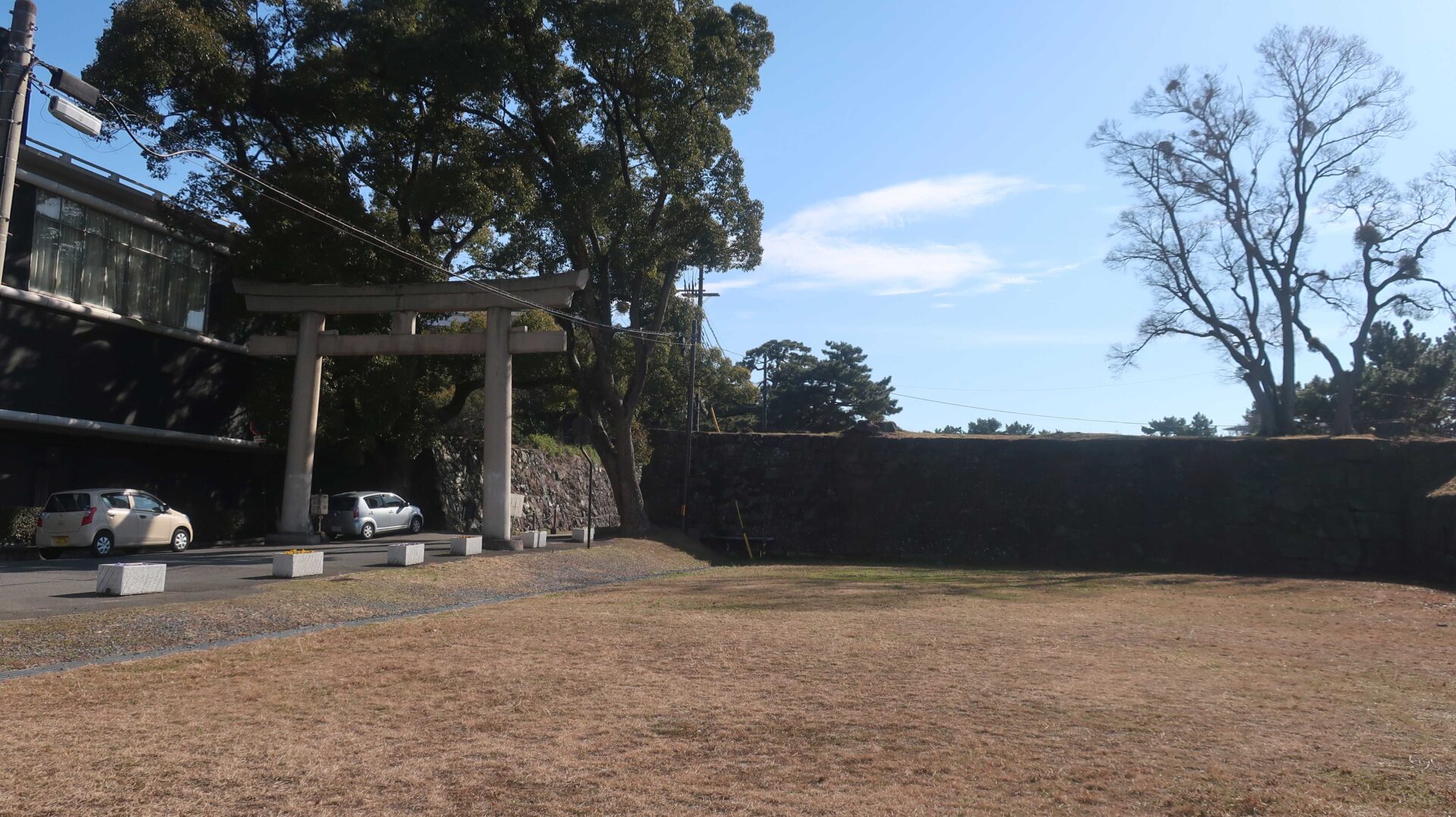 その敷地から見た本丸御殿。意外と遠くに見えるなあ。そして神社へ