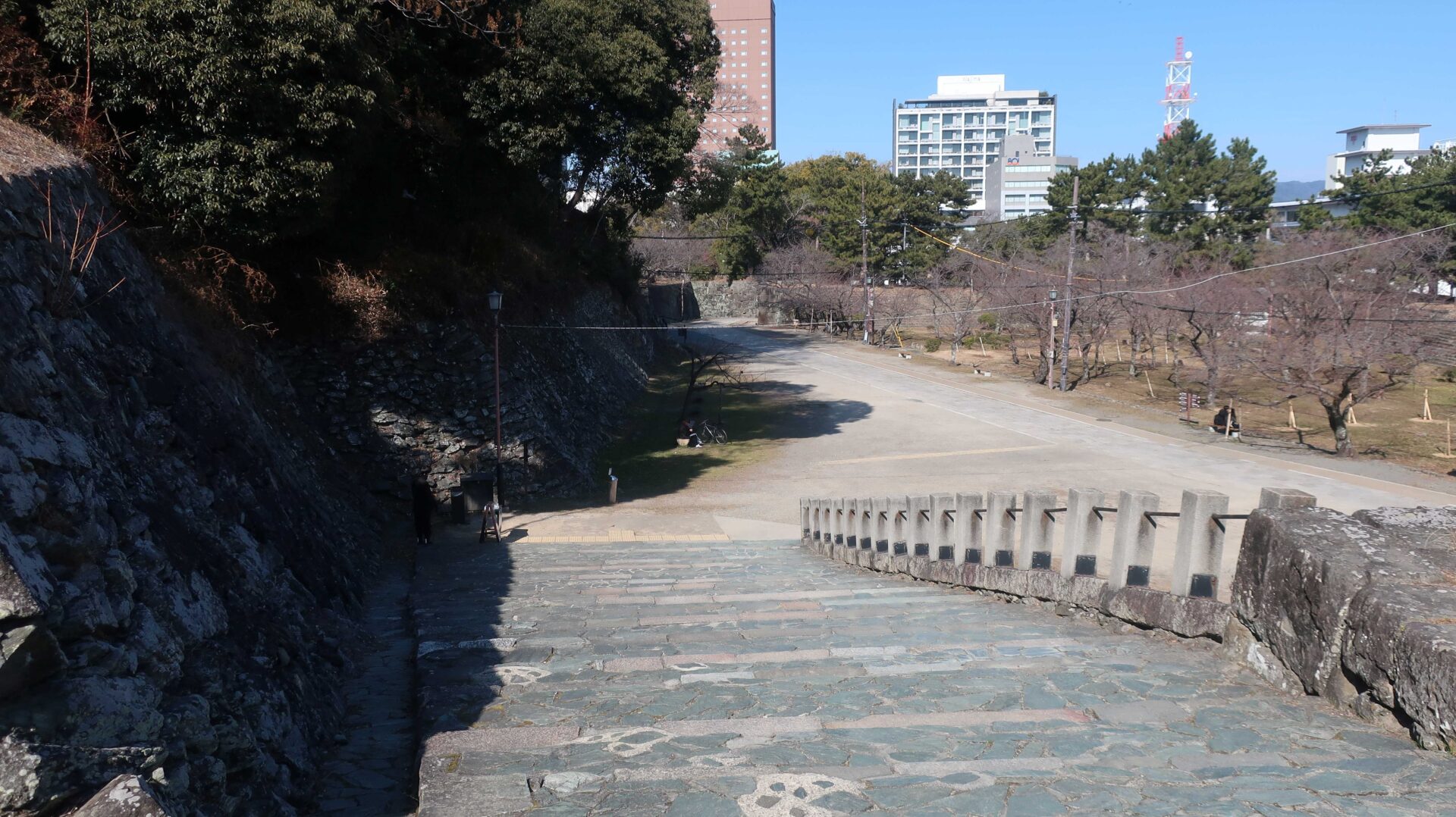 天守方面へ階段が見えてくる。振り返ると広いが登る方は狭くなっていく感じ
