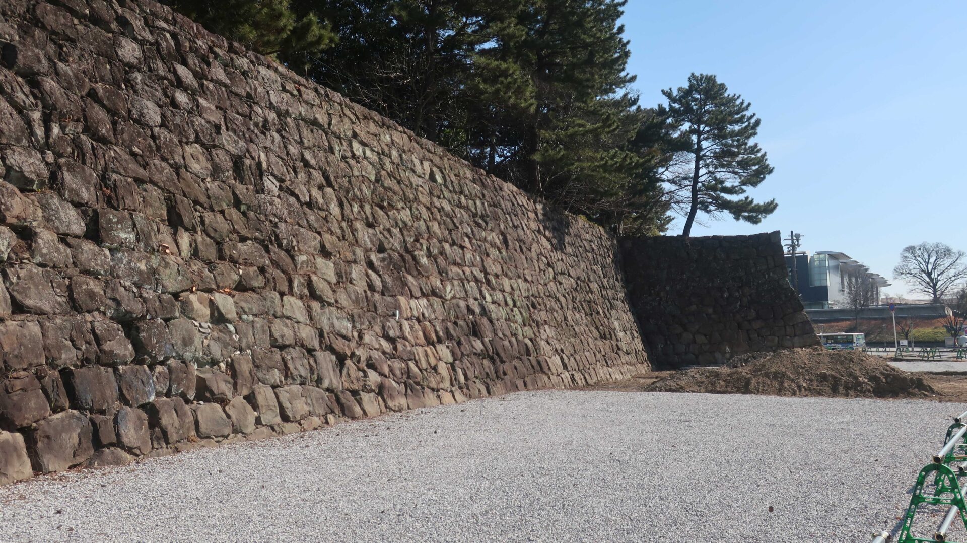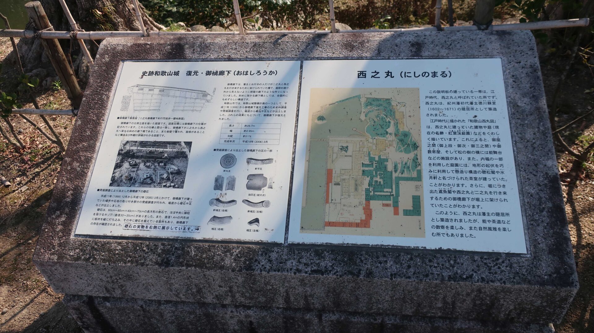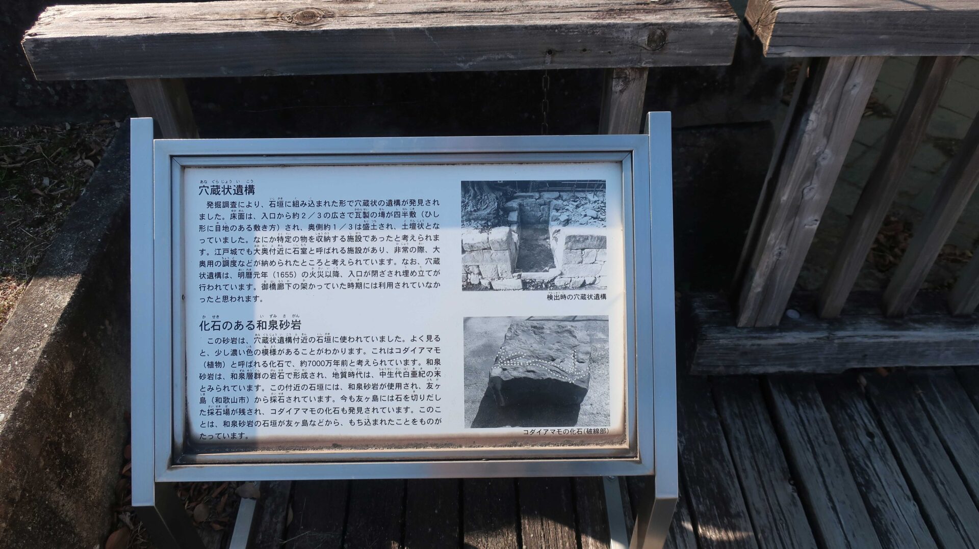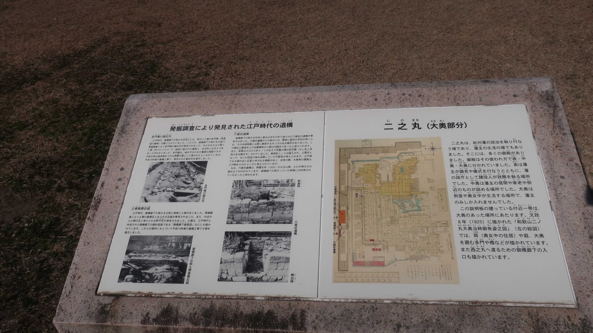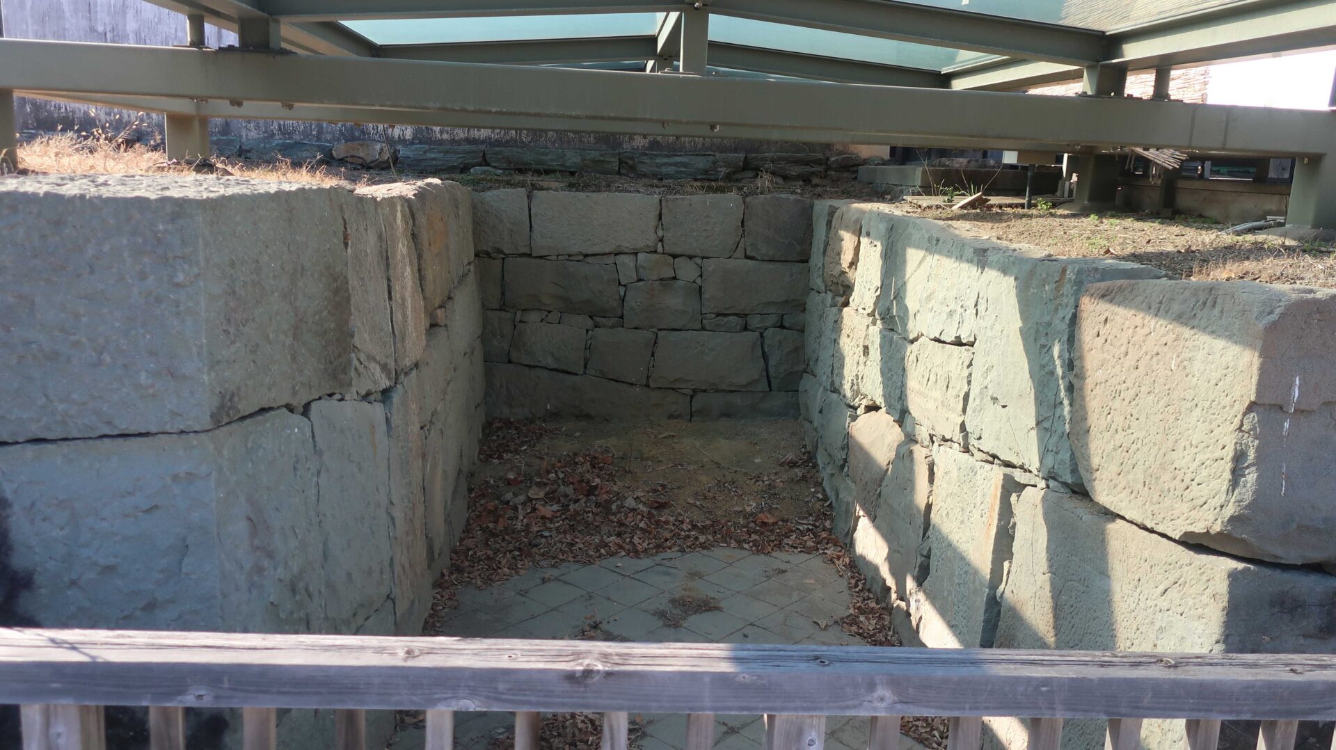 廊下を外に出ると右手には遺構が展示されている。真ん中は二の丸。先ほど見たところ。