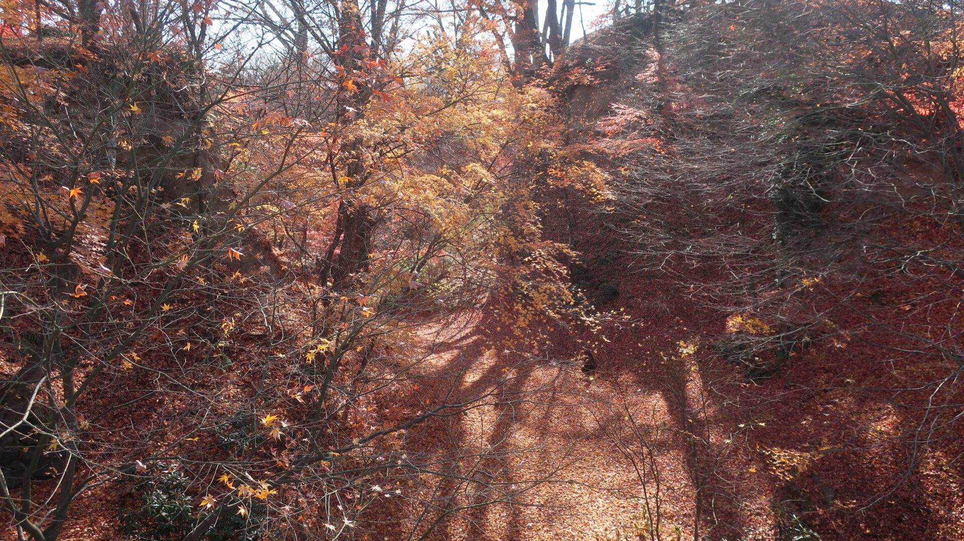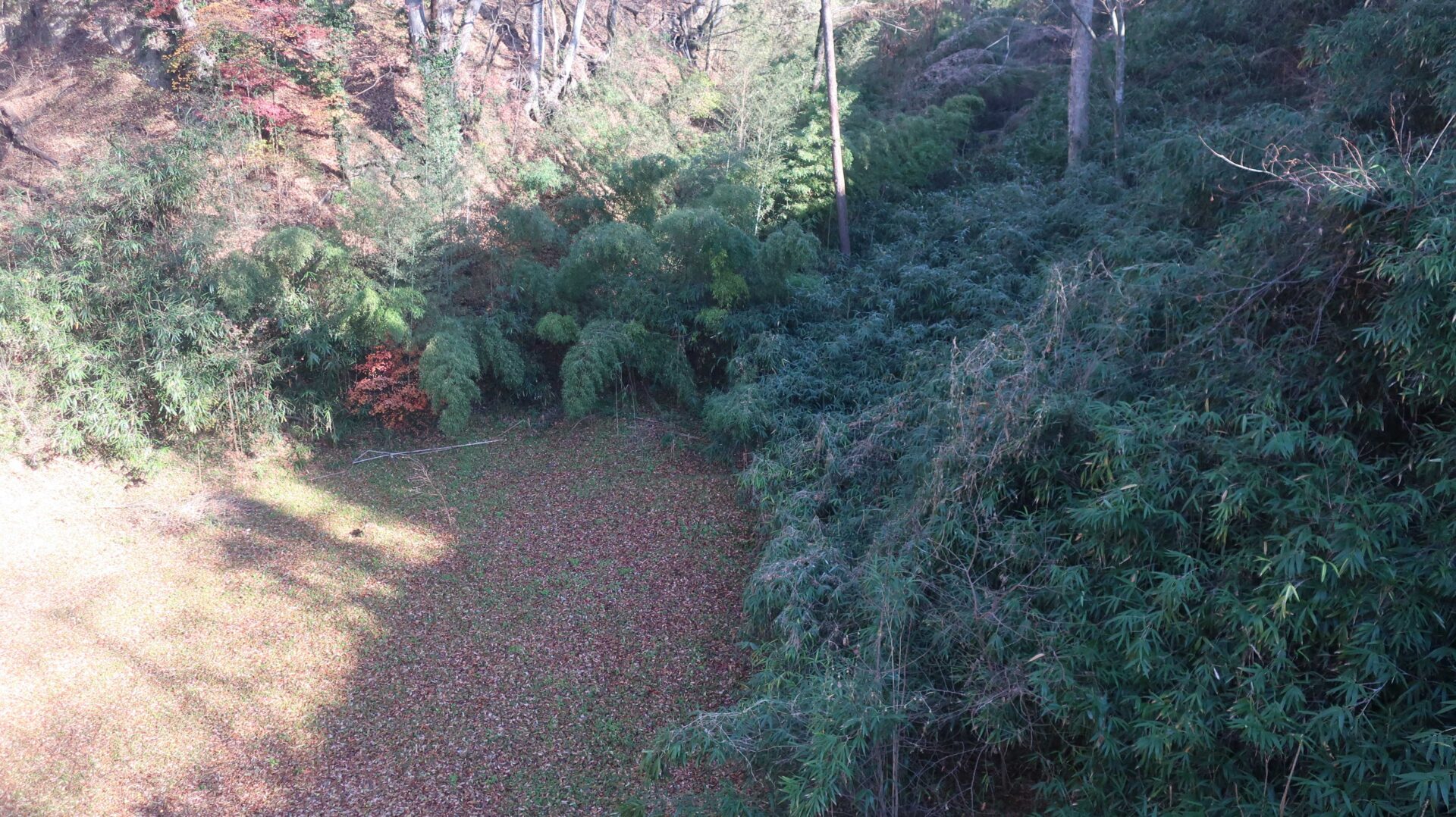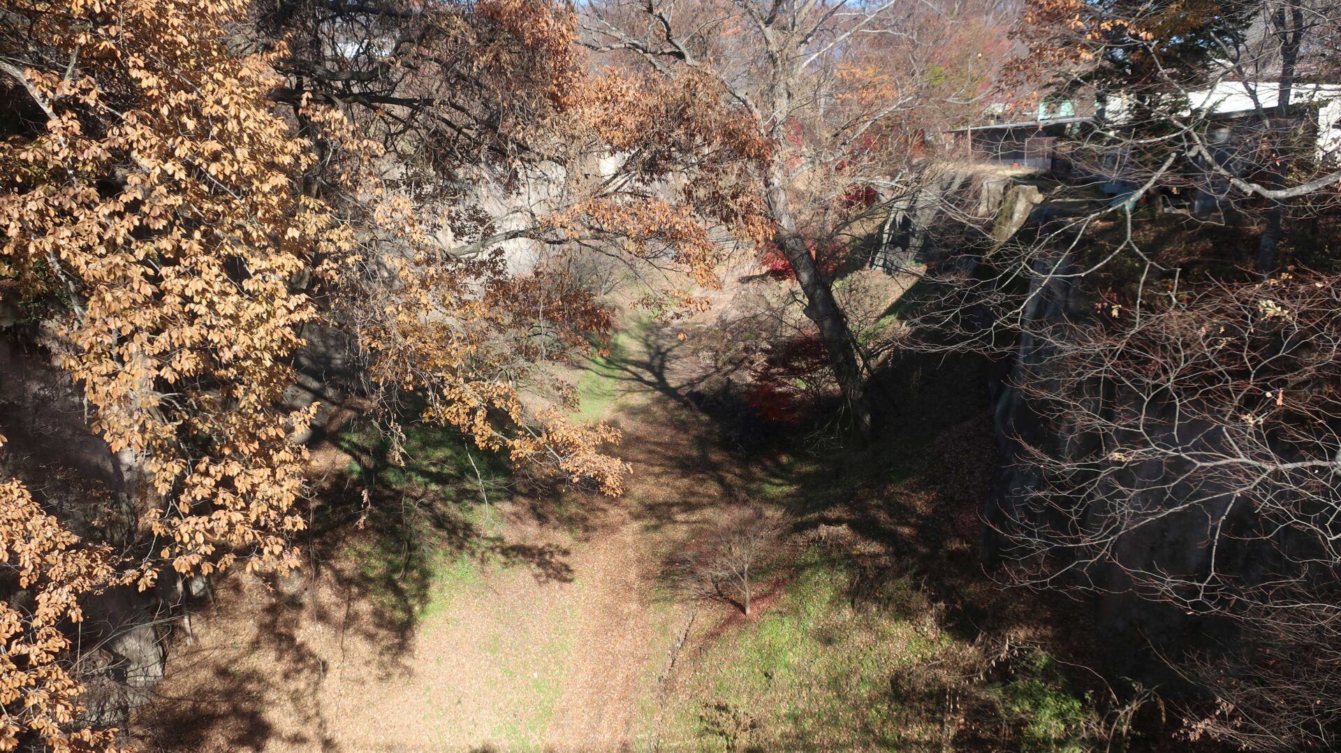 南の丸跡の反対側から降りて、右端に見える橋へ。橋からは意外と深い谷が。堀の役目をしっかり果たすだろう。