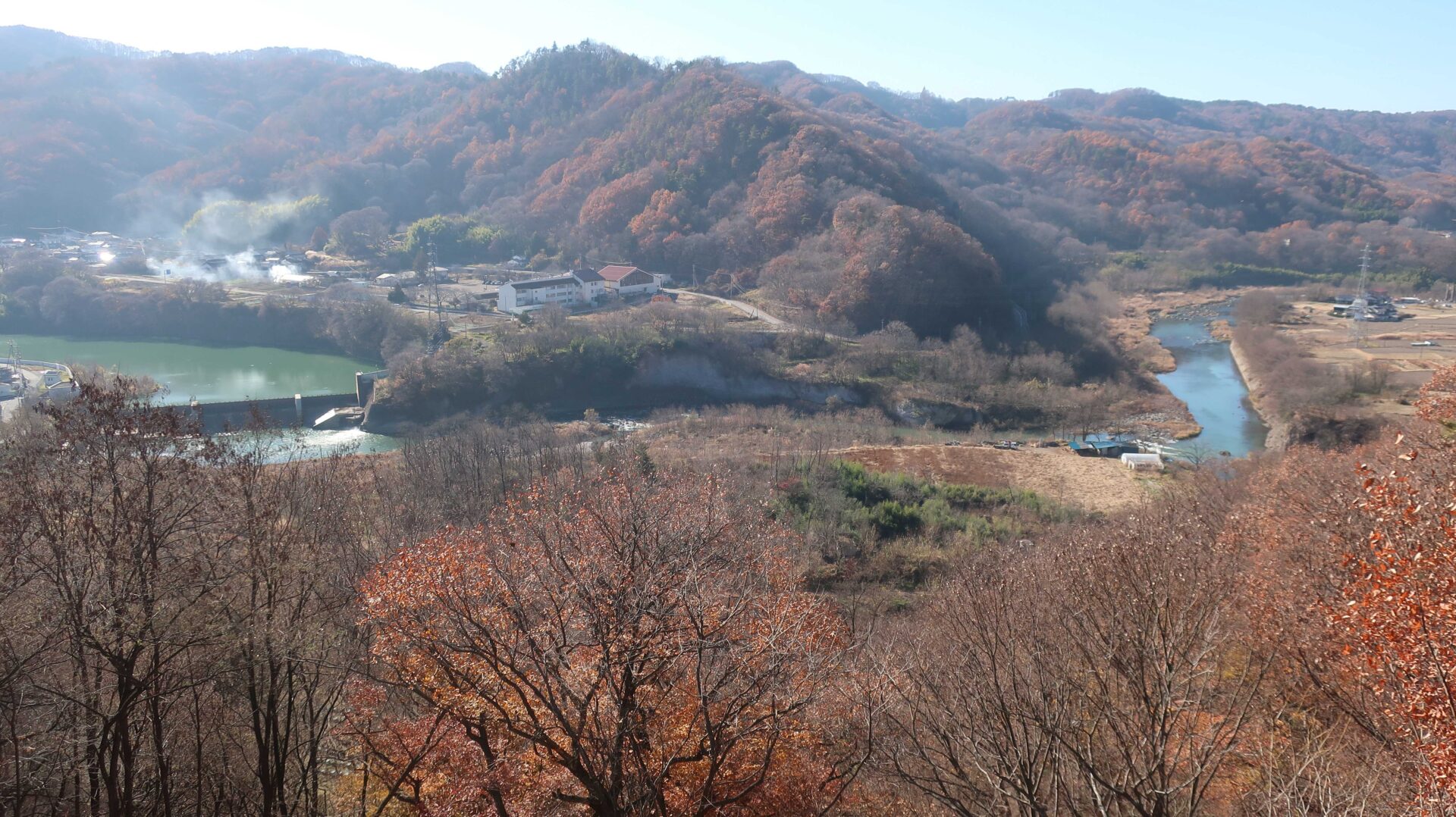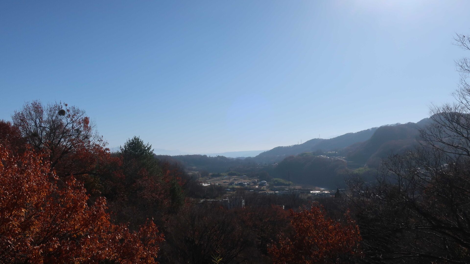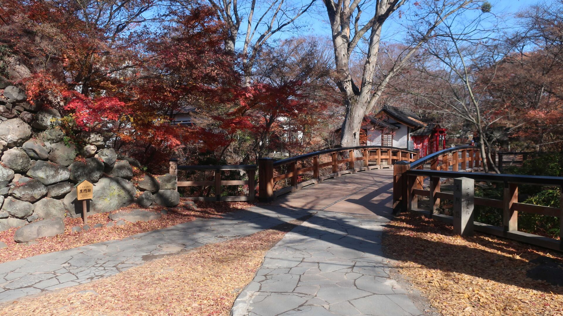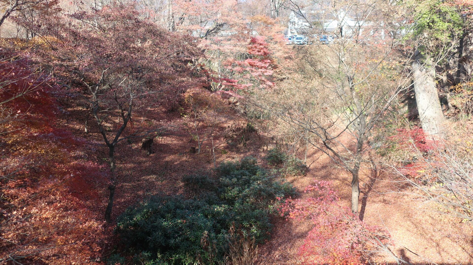 南の丸跡の反対側から降りて、右端に見える橋へ。橋からは意外と深い谷が。堀の役目をしっかり果たすだろう。