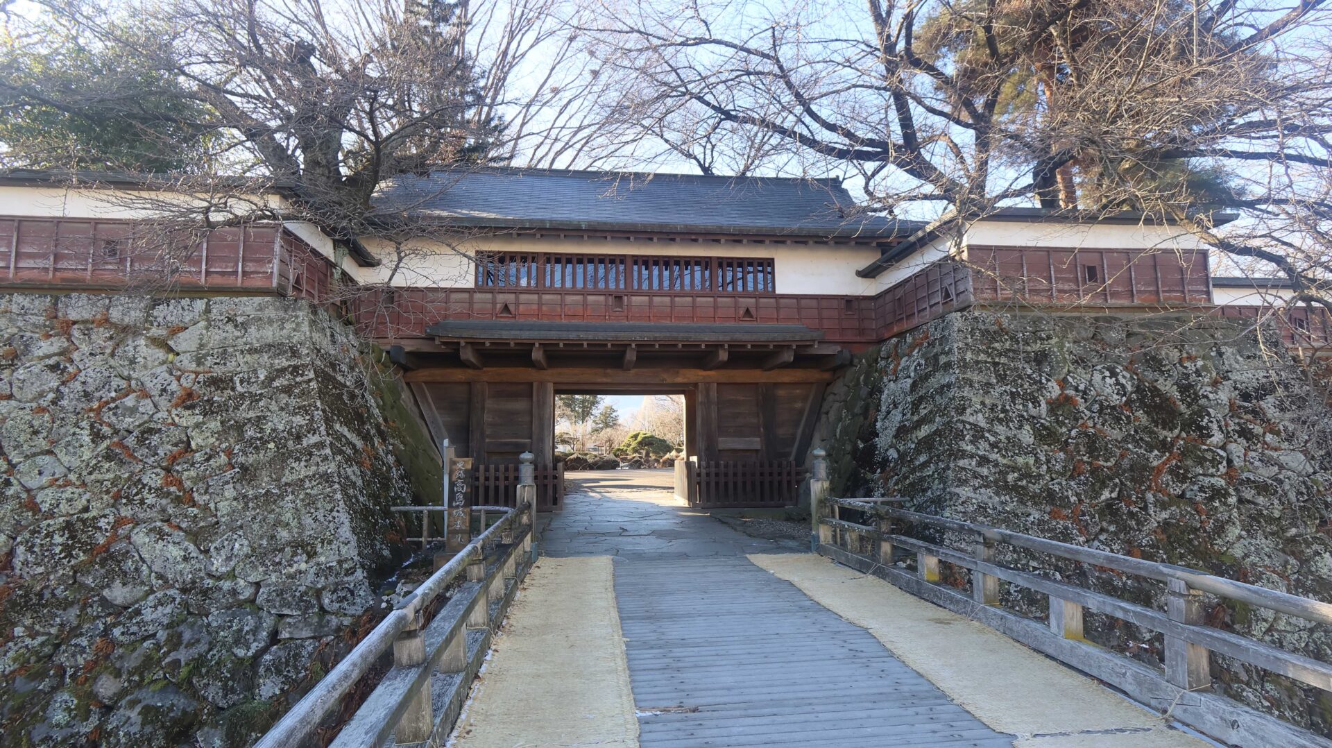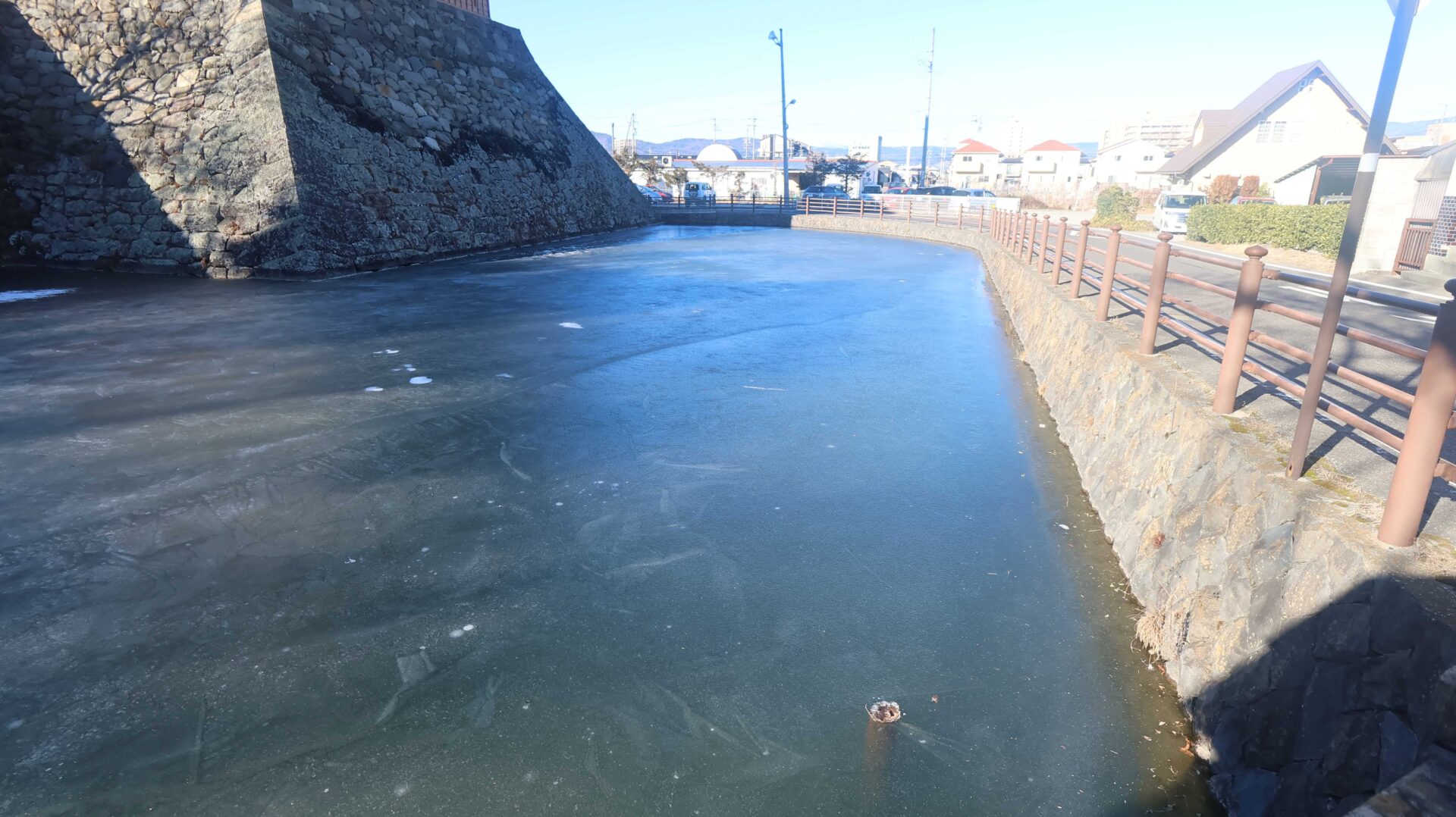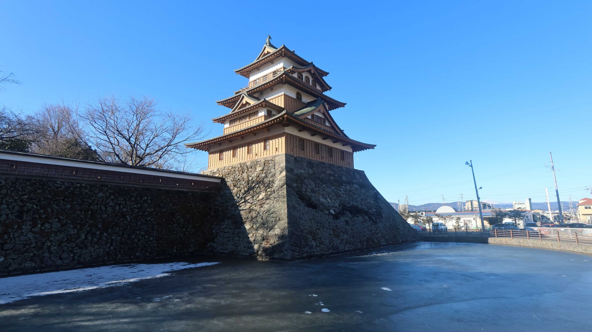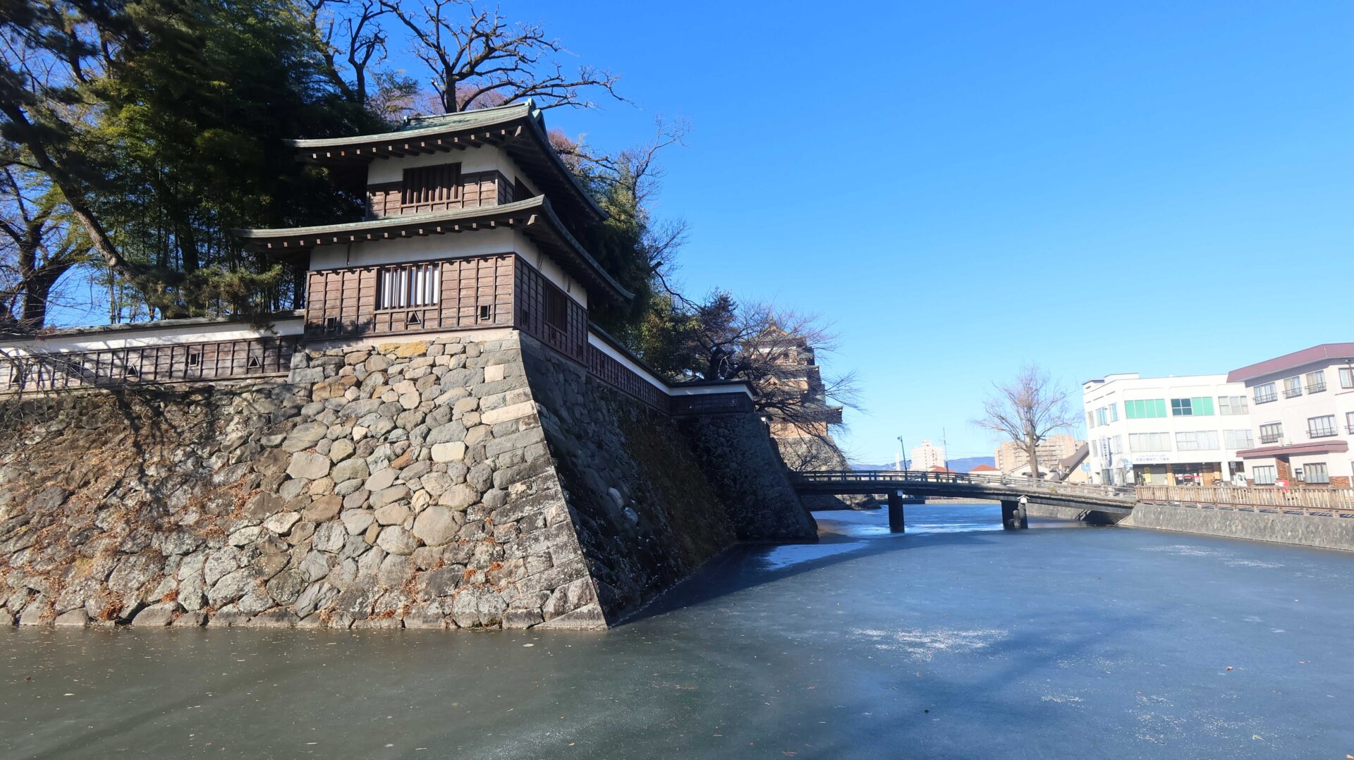 まだ午前中ということもあり氷が張っている。氷をバックに城。復元されたものだが。門をくぐらずまずは外周へ