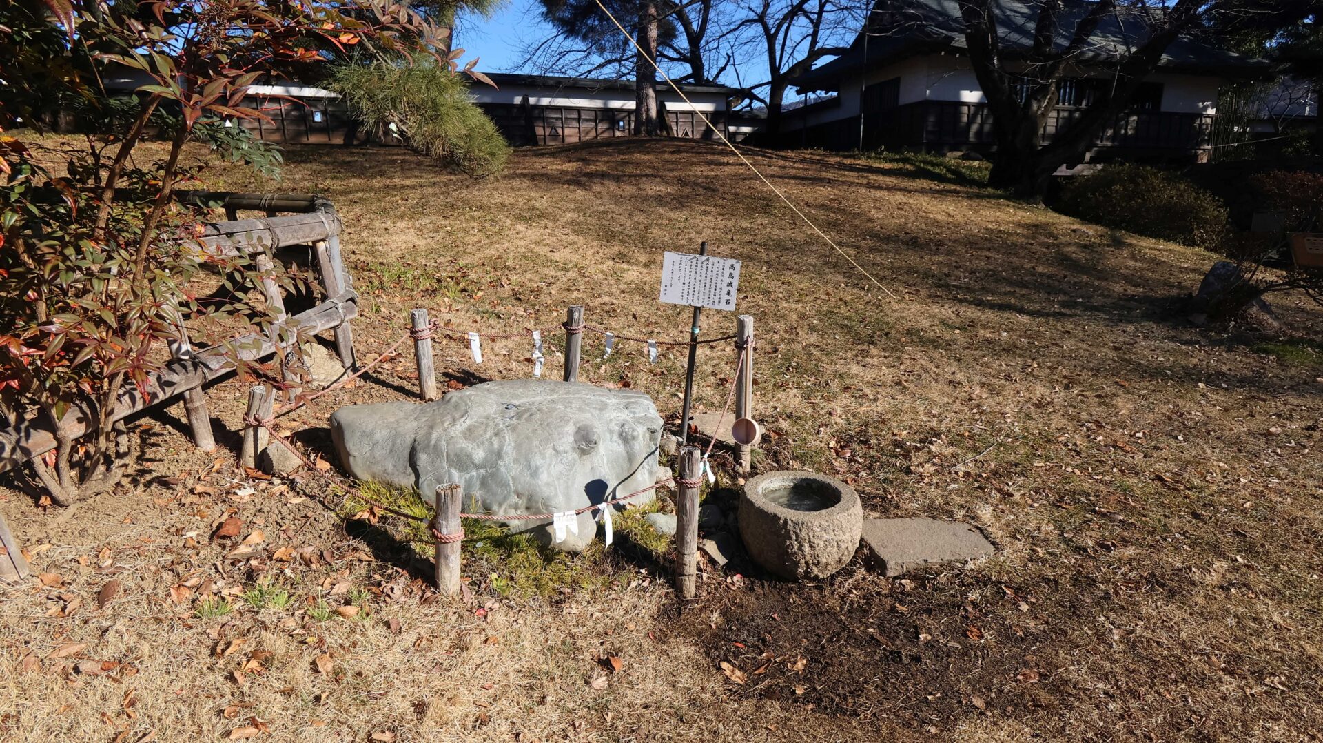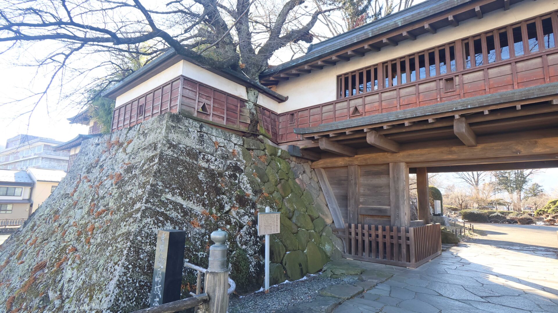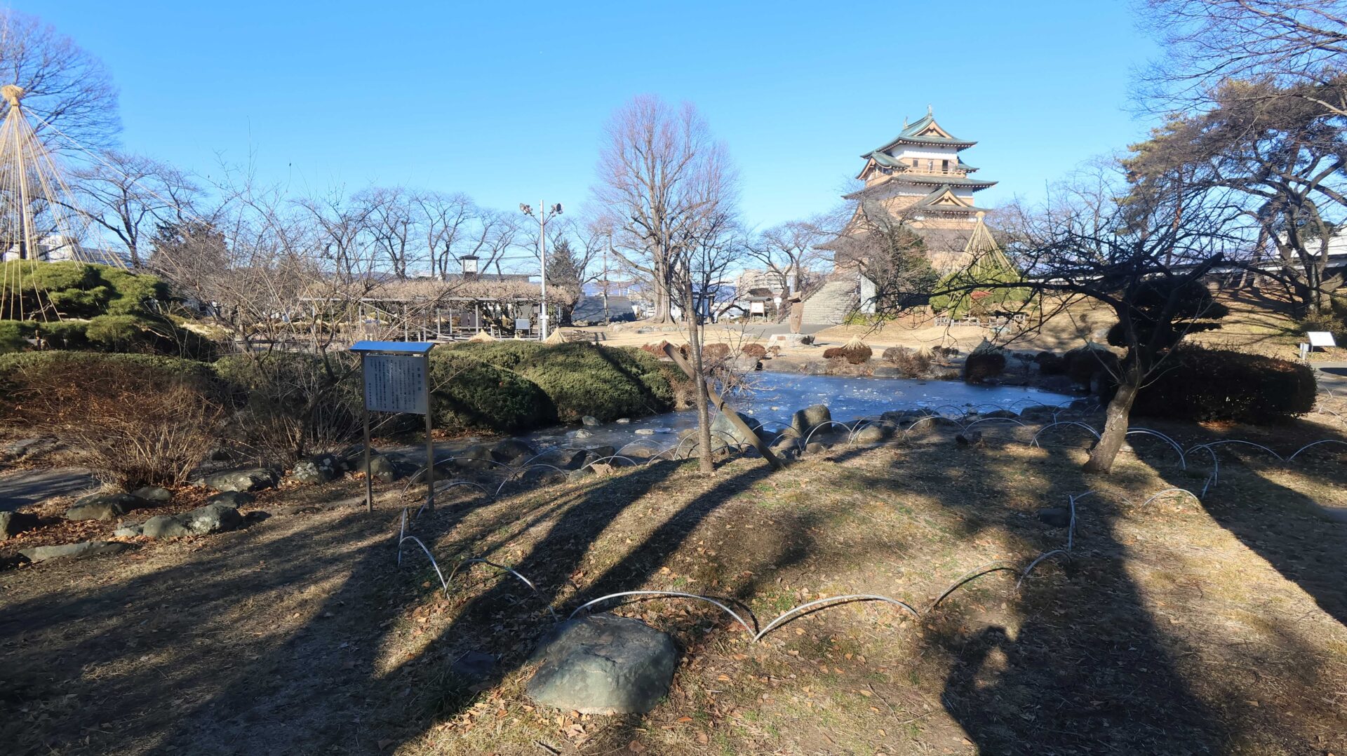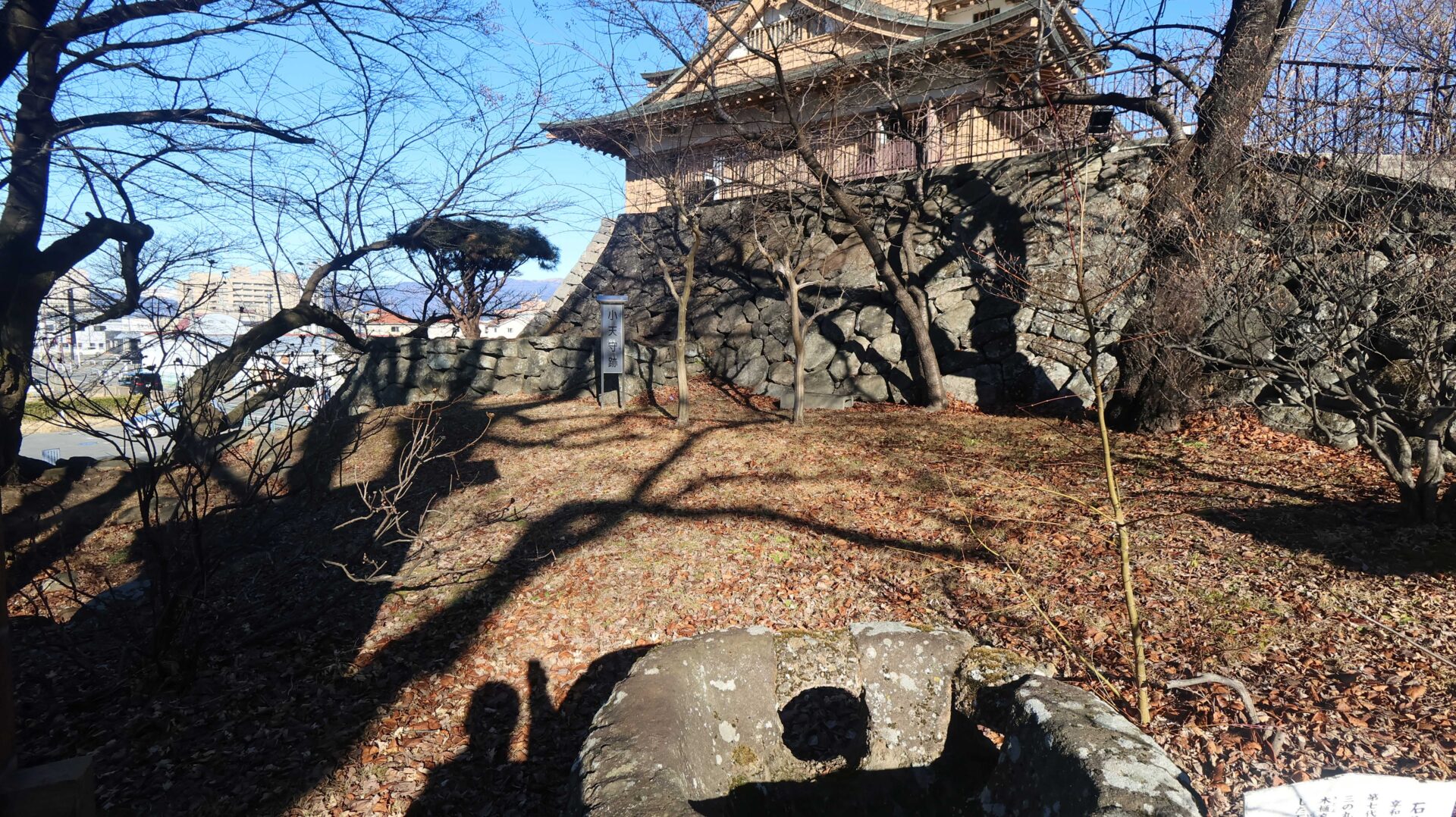 能舞台跡。もう少し弾いてみると城との対比が中々良い。とはいっても冬なので色が無いのが残念