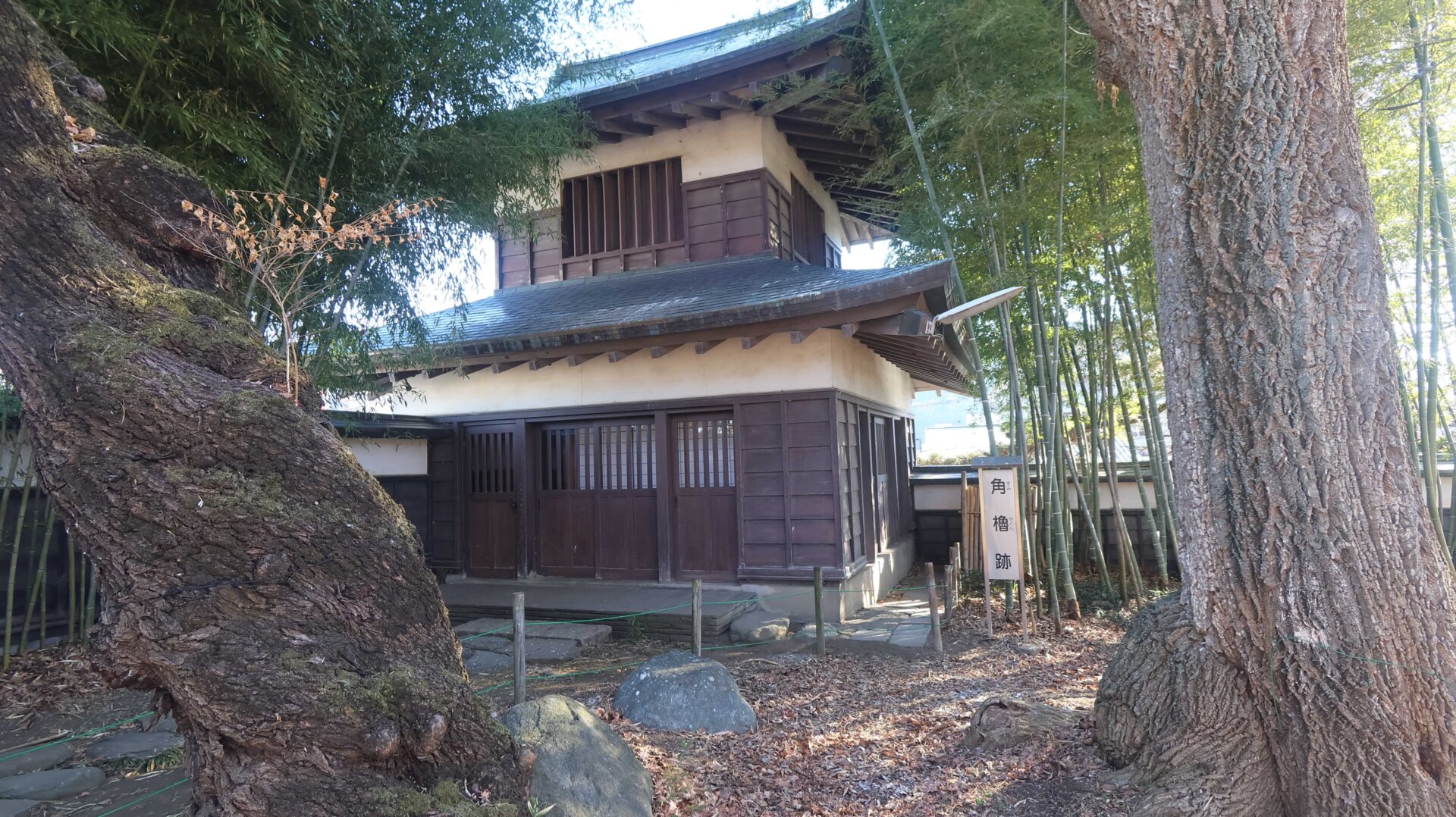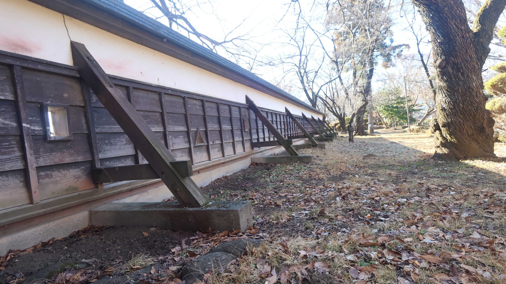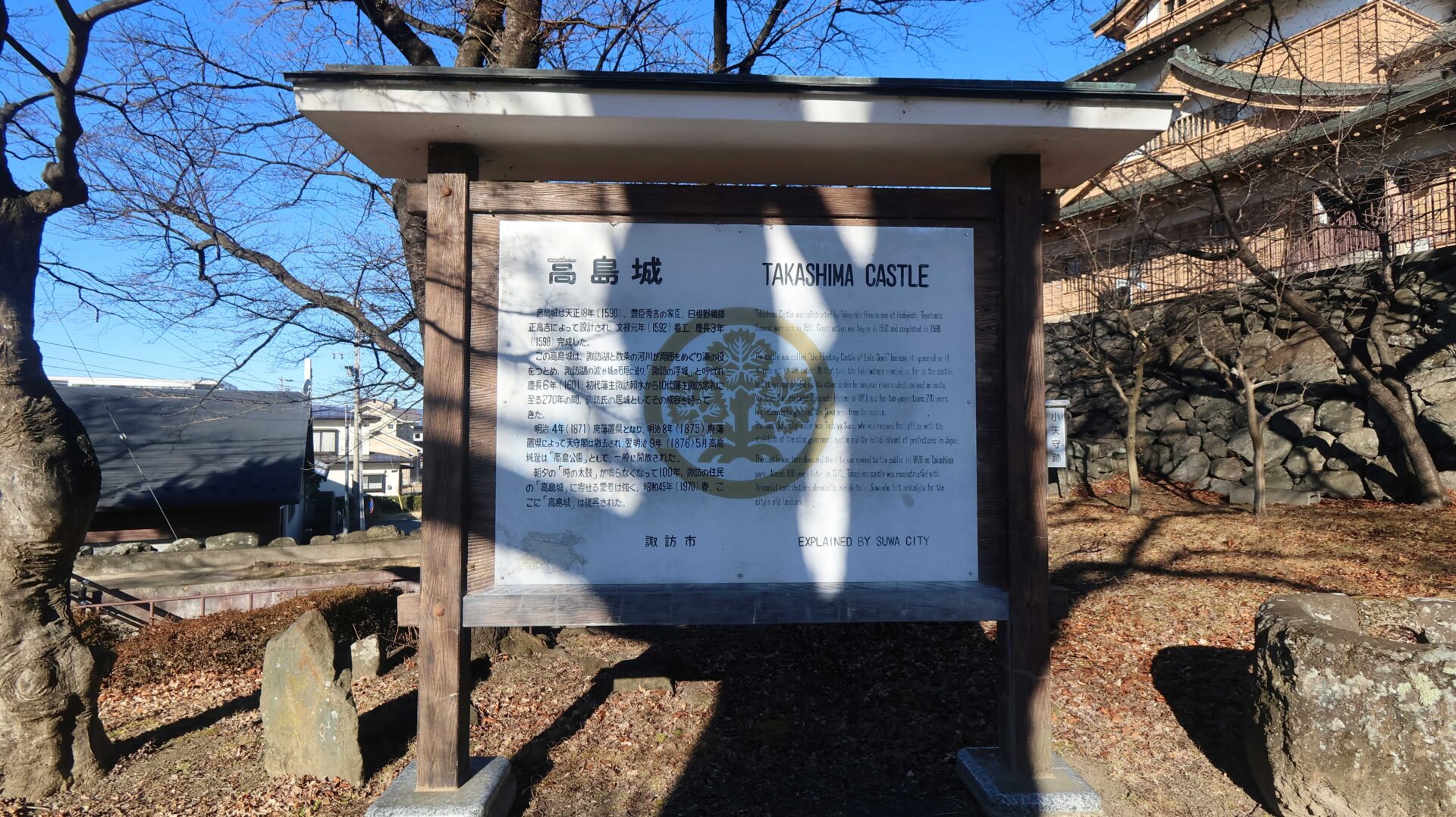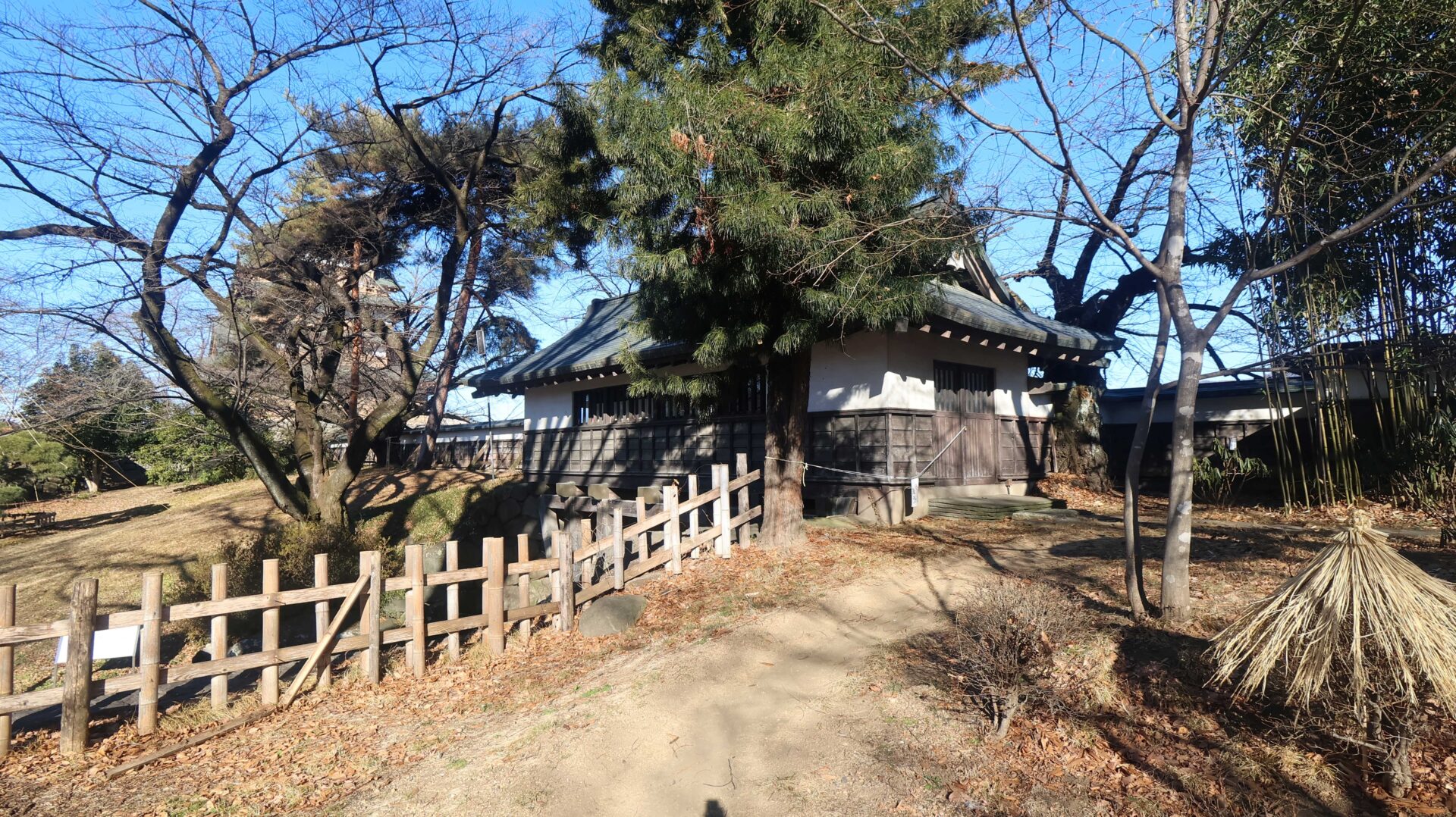 能舞台跡。もう少し弾いてみると城との対比が中々良い。とはいっても冬なので色が無いのが残念